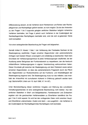 STAATSNIINISTERIUM DER JUSTIZ 5 Freistaat SACHSEN Differenzierung danach, ob die Verfahren durch Richterinnen und Richter oder Rechts- pflegerinnen und Rechtspfleger geführt werden, ist nicht möglich. Da die den Antworten zu den Fragen 1 bis 3 zugrunde gelegten amtlichen Statistiken lediglich richterliche Verfahren beinhalten, bei Frage 4 jedoch auch Verfahren in der Zuständigkeit der Rechtspflegerinides Rechtpflegers beinhaltet sind, sind die sich er-gebenden Werte nicht kompatibel. Von einer weitergehenden Beantwortung der Fragen wird abgesehen. Gemäß Artikel 51 Absatz 1 Satz 1 der Verfassung des Freistaates Sachsen ist die Staatsregierung verpflichtet, Fragen einzelner Abgeordneter oder parlamentarische Anfragen nach bestem Wissen unverzüglich und vollständig zu beantworten. Nach dem Grundsatz der Verfassungsorgantreue ist jedes Verfassungsorgan verpflichtet, bei der Ausübung seiner Befugnisse den Funktionsbereich zu respektieren, den die hierdurch mitbetroffenen Verfassungsorgane in eigener Verantwortung wahrzunehmen haben. Dieser Grundsatz gilt zwischen der Staatsregierung und dem Parlament sowie seinen einzelnen Abgeordneten, so dass das parlamentarische Fragerecht durch die Pflicht des Abgeordneten zur Rücksichtnahme auf die Funktions- und Arbeitsfähigkeit der Staatsregierung begrenzt wird. Die Staatsregierung muss nur das mitteilen, was inner- halb der Antwortfrist mit zumutbarem Aufwand in Erfahrung gebracht werden kann (vgl. SächsVerfGH, Urteilvom 16. April 1998, Vf. 14-l-97). Unter Berücksichtigung dieser rechtlichen Vorgabe und Wahrung des zumutbaren Venvaltungsaufiruandes ist eine weitergehende Beantwortung nicht leistbar. Aus den amtlichen Statistiken in Straf- und Bußgeldsachen, Familiensachen und Zivilsachen ergeben sich die gewünschten Verfahrensdaten zu Eilverfahren betreffend die Fra- gen 1 bis 3 nicht separat. Es wird bei den vorliegenden Daten nicht zwischen Haupt und Eilverfahren unterschieden. Zudem sind darin - wie ausgeführt - die Verfahren in der Zuständigkeit der Rechtspflegerin/des Rechtpflegers nicht beinhaltet. Seite 3 von 5