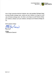 srAArsMrNrsrERruM Freistaat SACHSEN I# Die zu Frage 4 genannte Anzahl der Verfahren, die zu den jeweiligen Stichtagen länger als sechs Monate anhängig waren, enthält auch jene Verfahren, die länger als zwölf oder 24 Monate anhängig waren. Die Werte zu den länger als zwölf Monate anhängi- gen Verfahren umfassen auch jene Verfahren, die länger als 24 Monate anhängig wa- ren. Mit freundlichen Grüßen n Ä^; Anlage 1 tabellarische Übersicht Seite 5 von 5