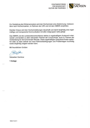 STAATSMINISTERIUM Freistaat FÜR WISSENSCHAFT SACHSEN KULTUR UND TOURISMUS Zur Gestaltung des Wintersemesters wird den Hochschulen eine Abstimmung, insbeson dere nach Hochschularten, im Rahmen der LRK und mit dem SMWK empfohlen. Darüber hinaus wird den Hochschulleitungen dauerhaft und damit langfristig eine regel mäßige und transparente Kommunikation mit allen Zielgruppen nahe gelegt. Das SMWK und die Landesrektorenkonferenz stehen in regelmäßigem Austausch mitei nander und beraten zu allen relevanten Themen der Corona-Krise, auch zu Themen der Vorbereitung für die kommenden Monate. Diese regelmäßigen Gespräche finden weiter hin statt, so dass zeitnah auf neue Rahmenbedingungen und Problemlagen kurzfristig sowie langfristig reagiert werden kann. Mit freundlichen Grüßen Sebastian Gemkow 1 Anlage Seite 3 von 3