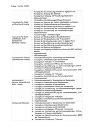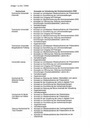 Anlage 1 zu Drs. 7/2083 Hochschule Konzepte zur Umsetzung des Sommersemesters 2020 Technische Universität Konzept zur schrittweisen Wiederaufnahme der Präsenzlehre Chemnitz Konzept zur Durchführung der Lehrveranstaltungen Konzept zum Umgang mit Prüfungen Konzept zur (Nicht)Anrechnung des Sommersemesters 2020 Konzepte zur Öffnung bzw. Nutzung verschiedener Einrichtungen (Hochschulbibliothek, Labore etc.) Verhaltensregeln Hygienekonzept Technische Universität Konzept zur schrittweisen Wiederaufnahme der Präsenzlehre Dresden Konzept zur Durchführung von Lehrveranstaltungen Konzept zum Umgang mit Prüfungen Konzept zur (Nicht)Anrechnung des Sommersemesters 2020 Konzepte zur Öffnung bzw. Nutzung verschiedener Einrichtungen (Hochschulbibliothek, Labore etc.) Verhaltensregeln Hygienekonzept Technische Universität Konzept zur schrittweisen Wiederaufnahme der Präsenzlehre Bergakademie Freiberg Konzept zur Durchführung von Lehrveranstaltungen Konzept zum Umgang mit Prüfungen Konzept zur (Nicht)Anrechnung des Sommersemesters 2020 Konzepte zur Öffnung bzw. Nutzung verschiedener Einrichtungen (Hochschulbibliothek, Labore etc.) Verhaltensregeln Hygienekonzept Universität Leipzig Konzept zur schrittweisen Wiederaufnahme der Präsenzlehre Konzept zur Durchführung von Lehrveranstaltungen Konzept zum Umgang mit Prüfungen Konzept zur (Nicht)Anrechnung des Sommersemesters 2020 Konzepte zur Öffnung bzw. Nutzung verschiedener Einrichtungen (Hochschulbibliothek, Labore etc.) Verhaltensregeln Hygienekonzept Hochschule für Konzept zur Nutzung der Ateliers, Werkstätten und Labore Bildende Künste Konzept zur Wiederaufnahme der Präsenzlehre Dresden Konzept für die Umsetzung der Lehre in digitaler Form Konzept zur Durchführung der Abschlussprüfungen Konzept zur Durchführung der Aufnahmeprüfungen Konzept zur Nutzung der Büros innerhalb der Verwaltung Hygienekonzept Verhaltensregeln Hochschule für Musik Konzept zur Wiederaufnahme des Übebetriebes Carl Maria von Weber Konzept zur Wiederaufnahme der Präsenzlehre Dresden Konzept für die Umsetzung der Lehre in digitaler Form Konzept zur Durchführung der Abschlussprüfungen Konzept zur Durchführung der Aufnahmeprüfungen Hygienekonzept Verhaltensregeln Palucca Hochschule für Konzept zur Wiederaufnahme des Trainingsbetriebes Tanz Dresden Konzept zur Wiederaufnahme der Präsenzlehre an der Hochschule Konzept zur Wiederaufnahme des Unterrichts an der Öberschule