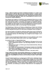 STAATSM1N1STER1UM FÜR SOZ1ALES Freistaat UND GESELLSCHAFTUCHEN SACHSEN ZUSAMMENHALT Fr ag e 1: Welc he Pr o j ek t e d es Ver eins Ausländ er r at Dr esd en e.V. w ur d en in d en Haushalt sj ahr en 2015 b is 2020 d ur c h d en Fr eist aat Sac hsen in j ew ells w elc her Hö he und auf g r und w elc her Fö r d er r ic ht linie b zw . Ver einb ar ung an w elc hen Sc hu- len und Einr ic ht ung en g ef ö r d er t ? (B it t e nac h Haushalt sj ahr en j e Sc hule und Ein- r ic ht ung d ie Pr o j ek t e auf g lied er n.) E ine Ü b e r s ic ht d e r P r o j e k t e ink l. F ö r d e r hö he , d ie a n s ä c hs is c he n S c hule n b zw. a n s ä c h- sischen Bildungseinrichtungen in den Haushaltsj ahren 2015 bis 2020 um gesetzt wurden bzw. werden sind der Anlage 1 zu entnehm en. Die Angaben zur Förderhöhe (bewilligt — bzw. ausgezahlt) ergeben sich aus dem Bearbeitungsstand des Verfahrens. Bei laufen- den Proj ek ten bzw. bei Proj ek ten, die noch nicht abschließend die Verwendungsnach- weisprüfung durchlaufen haben, wird die bewilligte Förderung angezeigt. Die W eiterbildung im Rahm en der Förderung „W eiterbildung im Bereich der Kindheits- p ä d a g o g ik " d e s S ä c hs is c he n S t a a t s m inis t e r ium f ü r W ir t s c ha f t , Ar b e it und V e r k e hr wur d e f ü r e ine n Mit a r b e it e r d e s V e r e ins d ur c h d a s Ad ve nt - K ind e r g a r t e n- Ins t it ut d ur c hg e f ü hr t . D ie L is t e d e r P r o j e k t e und P r o j e k t o r t e , g e m ä ß d e r Aus f ü hr ung e n a us d e n V o r b e m e r k un- gen, die im Rahm en der Förderung aus der Richtlinien Integrative Maßnahm en (RL IM) und W eltoffenes Sachsen (RL W OS) erfolgen bzw. erfolgten sind den Anlagen 2 und 3 zu entnehm en. P r o j e k t e , d ie ü b e r d a s S ä c hs is c he S t a a t s m inis t e r ium f ü r K ult us g e f ö r d e r t wur d e n, f a nd e n j e we ils in d e r K it a „ K le ine r G lo b us " s t a t t und s ind in d e r Anla g e 4 d a r g e s t e llt . Es handelt sich dabei um folgende Maßnahm en: • Modellprojekt „Lust auf Vielfalt" zu der Fragestellung „Wie lassen sich die von den Kindern mitgebrachten Sprachen in den Kita-Alltag einbeziehen und wie wirken Eltern mit? • pädagogisches Projekt zur Einführung der Dokumentationsmethode „Bildungs- und Lerngeschichten" • zwei Projekte zum praxisorientierten Fachaustausch zwischen den Fachkräften verschiedener Kindertageseinrichtungen zu den Themen Mehrsprachigkeit, Mig- ration, interkulturelle Pädagogik und lnklusion • Fachtagung zum Thema „Pädagogisch kontrovers — Eine Kita für Alle?!" Frage 2: Welche Konzepte, Handlungsziele, Maßnahmen zur Umsetzung der Hand- lungsziele und Zielgruppen lagen den einzelnen Projekten nach Ziffer 1 zugrunde? (Bitte nach Haushaltsjahren je Schule und Einrichtung für jedes Projekt aufglie- dern.) Mit jeder Projektantragstellung im Landesprogramm WOS werden vollständige Antrags- unterlagen mit einer trägerspezifischen Projektkonzeption vorgelegt, die mit einer Zielpy- ramide untersetzt ist. Die lnformationen für reguläre WOS-Projekte aus den Jahren 2015- 2020 sind der beigefügten Anlage 5 zu entnehmen. Eine Auflistung sächsischer Schulen bzw. Bildungseinrichtungen, an denen diese Projekte umgesetzt wurden, ist der Anlage 3 zu entnehmen. Die Auflistung zum laufenden Projekt 2020 kann nicht angezeigt wer- den. Seite 2 von 5