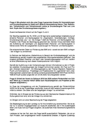 STAATSM1N1STER11JM FÜR SOZ1ALES Freistaat 1.1ND GESELLSCHAFTLICHEN SACHSEN ZUSAMMEMIALT Fr ag e 4: Wie g lied er n sic h d ie unt er Fr ag e 3 g enannt en K o st en f ü r Ver anst alt ung en und Dr uc k er zeug nisse im Det ail auf ? (B it t e j e Ver anst alt ung Dat um , Tit el, Ref er en- t en, Tellnehm er ar t und Teilnehm er zahl so w ie j e Dr uc k er zeug nis Tit el und L ink b zw . K o p ie d es Dr uc k er zeug nisses ang eb en.) Zusam m enfassende Antwort auf die Fragen 3 und 4: Der Bewilligungsstelle der RL W OS und IM liegt k eine system seitige Aufgliederung auf einzelne Personal- und Sachausgaben für „Organisation, Veranstaltungen, Vorträge, Druck erzeugnisse usw." vor. Die Anlage 7 stellt die Personal- und Sachausgaben der Proj ek te in der Phase der Beantragung gesondert dar. Darüber hinaus beinhaltet diese die Aufstellung der bewilligten und abgerechneten Personal- und Sachausgaben in Gänze sowie Höhe der ausgezahlten Zuwendungen für Personal- und Sachausgaben. D ie e nt s p r e c he nd e n D a t e n zur F ö r d e r ung d e s S MK s ind — s o we it s ie d e m S MK vo r lie g e n - der Anlage 4 zu entnehmen. Im Rahmen der Maßnahme „Weiterbildung im Bereich der Kindheitspädagogik" wird die Weiterbildung gemäß Angebot des ausgewählten Bildungsdienstleisters gefördert. Das Angebot schlüsselt Personal- und Sach- oder Verwaltungsausgaben nicht auf, insofern ist eine Differenzierung nach diesen Kostenpositionen nicht möglich. Gemäß der Ausführung in den Vorbemerkungen können Informationen zu den in Projek- ten erstellten Druckerzeugnissen der Anlage 8 entnommen werden. Ein Flyer zum Pro- jekt „'Grenzen überwinden - Ein Bildungsprojekt zu den Themen Migration, Rassismus, Flucht und Kolonialismus - Projekttage und Projektwochen für Jugendliche" kann unter: https://grenzen-ueberwinden-dd.de/wp-content/uploads/sites/96/2018/07/Flyer-GU%CC %88-2018.pdf (zuletzt aufgerufen am 24.06.2020) heruntergeladen werden. Frage 5: Erhielt der Verein im Zeitraum 2015 bis 2020 weitere Fördermittel von Drit- ten? Wenn ja, in welcher Höhe? (Bitte nach Haushaltsjahren und Projekten je Mit- telgeber aufgliedern.) Im Zuge der Antragstellung und der Projektabrechnung gemäß der Förderrichtlinien WOS und IM ist der Projektträger verpflichtet, Auskunft über weitere Zuwendungen/Dritt- mittel zu erteilen. Die Daten sind der beigefügten Anlage 7 zu entnehmen. Drittmittel, die im Einsatz bei der Förderung aus dem Sächsischen Staatsministerium für Kultus gekommen sind, sind der Anlage 4 zu entnehmen. Im Übrigen wird von einer Beantwortung der Frage abgesehen. Die Staatsregierung ist dem Landtag nur für ihre Amtsführung verantwortlich. Sie ist da- her nur in solchen Angelegenheiten zur Auskunft verpflichtet, die in ihre Zuständigkeit fallen und muss nicht auf Fragen eingehen, die außerhalb ihres Verantwortungsbereichs liegen. Letzteres ist hier der Fall, denn die Frage betrifft ausschließlich Tätigkeiten, die von ei- nem Privaten, dem eingetragenen Verein Ausländerrat Dresden, in eigener Zuständig- Seite 4 von 5
