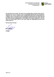 STAATSM1N1STER1UM FÜR SOZ1ALES Freistaat UND GESELLSCHAFTUCHEN SACHSEN ZUSAMMENHALT k e it wa hr g e no r nm e n we r d e n. D e r V e r e in is t e ine s e lb s t ä nd ig e j ur is t is c he P e r s o n d e s P r i- vatrechts und nirnm t im Hinblick auf den nachgefragten Sachverhalt k eine öffentlichen Aufgaben wahr. Ferner bestehen k eine vertraglichen Beziehungen der Staatsregierung zu d ie s e m V e r e in im H inb lic k a uf d e n na c hg e f r a g t e n S a c hve r ha lt . Z ud e m wa r e n und s ind d e r E xe k u t i v e k e i n e M i t g l i e d s r e c h t e i n d e n O r g a n e n d e s V e r e i n s e i n g e r ä u m t . O b e r d i e Höhe von Zuwendungen Dritter an den Verein liegen der Staatsregierung daher k eine Erk enntnisse vor. Mit freundlichen Grüßen Pétra Anlag en Seite 5 von 5