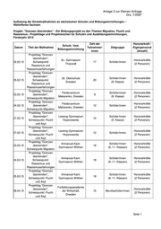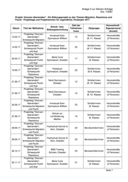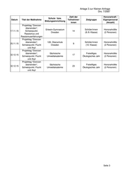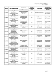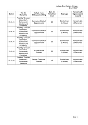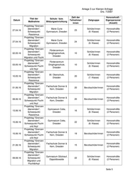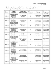 Anlage 3 zur Kleinen Anfrage Drs. 7/2587 Zahl der Honorarkraft / Titel der Schule / bzw. Datum Teilnehmer/ Zielgruppe Eigenpersonal Maßnahme Bildungseinrichtung innen (Anzahl) Projekttag "Grenzen überwinden", Gymnasium Glückauf, Schüler/innen Honorarkräfte 09.08.16 Schwerpunkt 20 Dippoldiswalde (8. Klasse) (2 Personen) Migration und Flucht&Asyl Projekttag "Grenzen überwinden", Gymnasium Glückauf, Schüler/innen Honorarkräfte 10.08.16 Schwerpunkt 22 Dippoldiswalde (8. Klasse) (2 Personen) Migration und Flucht&Asyl Projekttag "Grenzen überwinden", Gymnasium Glückauf, Schüler/innen Honorarkräfte 10.08.16 Schwerpunkt 20 Dippoldiswalde (8. Klasse) (2 Personen) Migration und Flucht&Asyl Projekttag "Grenzen überwinden", 56. Oberschule, Schüler/innen Honorarkräfte 19.09.16 Schwerpunkt 20 Dresden (9. Klasse) (2 Personen) Migration und Flucht&Asyl Projekttag "Grenzen überwinden", Semper Oberschule, Schüler/innen Honorarkräfte 29.10.16 13 Schwerpunkt Dresden (8. Klasse) (2 Personen) Rassismus Seite 6