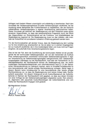 STAATSMlNiSTERiUM Freistaat DES iNNERN „ SACHSEN Anfragen nach bestem Wissen unverzüglich und vollständig zu beantworten. Nach dem Grundsatz der Verfassungsorgantreue ist jedes Verfassungsorgan verpflichtet, bei der Ausübung seiner Befugnisse den Funktionsbereich zu respektieren, den die hierdurch mitbetroffenen Verfassungsorgane in eigener Verantwortung wahrzunehmen haben. Dieser Grundsatz gilt zwischen der Staatsregierung und dem Parlament sowie seinen einzelnen Abgeordneten, so dass das parlamentarische Fragerecht durch die Pflicht des Abgeordneten zur Rücksichtnahme auf die Funktions- und Arbeitsfähigkeit der Staatsregierung begrenzt ist. Die Staatsregierung muss nur das mitteilen, was inner- halb der Antwortfrist mit zumutbarem Aufwand in Erfahrung gebracht werden kann. Für die Kommunalwahlen gilt darüber hinaus, dass die Staatsregierung dem Landtag nur für ihre Amtsführung verantwortlich ist. Sie ist daher nur in solchen Angelegenhei- ten zur Auskunft verpflichtet, die in ihre Zuständigkeit fallen und muss nicht auf Fragen eingehen, die außerhalb ihres Verantwortungsbereichs liegen. Dies ist hier der Fall, denn die Durchführung der kommunalen Wahlen ist der grundle- gende Akt der kommunalen Selbstorganisation, der von den Gemeinden als Ausfluss ihres verfassungsrechtiich verankerten kommunalen SelbstvenNaltungsrechts in eige- ner Verantwortung als Selbstverwaltungsaufgabe wahrgenommen wird. Selbstverwal- tungsaufgaben unterliegen nur der Rechtsaufsicht, nicht aber der Fachaufsicht. lm Zu- ständigkeitsbereich der Rechtsaufsicht können die Staatsregierung bzw. die hierfür zuständigen Rechtsaufsichtsbehörden vom Informationsrecht nach § 113 der Sächsi- schen Gemeindeordnung nur Gebrauch machen, wenn im Einzelfall Anhaltspunkte für eine bevorstehende oder bereits erfolgte Rechtsverletzung vorliegen. Bisher lagen in diesem Bereich keine Anhaltspunkte für eine bevorstehende oder bereits erfolgte Rechtsverletzung vor, so dass die Staatsregierung noch keinen Anlass hatte, Rechts- aufsicht auszuüben. Vor diesem Hintergrund ist ein Auskunftsanspruch der Aufsichts— behörde im Rahmen der Rechtsaufsicht nicht gegeben, so dass aus diesen Gründen von einer Anfrage bei den SelbstvenNaltungsträgern abgesehen wurde. Rein präventi— ve, allgemeine oder pauschale Auskunftsverlangen der Aufsichtsbehörde sind vom Institut der Rechtsaufsicht hingegen nicht gedeckt. Mit«fr ndlichen Grüßen rof Dr. Q oland Wöiler Seite 3 von 3