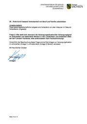 STAATSM1N1STER1UM FUR SOZ1ALES Freistaat UND GESELLSCHAFTL1CHEN SACHSEN ZUSAMMENHALT 20. Ä r zt e d ur c h b esser e Ver einb ar k eit vo n B er uf und Fam ille unt er st ü t zen Um setzunqstand: Diese gesam tgesellschaftliche Aufgabe wird fortlaufend von alien Ak teuren im Gesund- heitswesens um gesetzt. Fr ag e 2: Wie st ellt sic h d em nac h d ie Ver so r g ung ssit uat io n/d er Ver so r g ung sg r ad im am b ulant en und st at io när en B er eic h in d en L and k r eisen und k r eisf r eien St äd - t en d ar ? (Anzahl Fac här zt e, b it t e auf sc hlü sseln nac h Fac har zt r ic ht ung !) H ins ic ht lic h d e r B e a nt wo r t ung d ie s e r F r a g e wir d a uf d ie Anla g e n zur V e r s o r g ung s it ua t io n im am bulanten (Anlage 1) und stationären (Anlage 2) Bereich verwiesen. Mit freundlichen Grüßen Seite 10 von 10