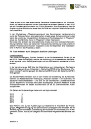 STAATSM1N1STER1UM FÜR SOZ1ALES Freistaat UND GESELLSCHAFTUCHEN SACHSEN ZUSAMMENHALT Diese wurden durch das federführende Sächsische Staatsm inisterium für W irtschaft, A r b e it und V e r k e hr zus a m m e n m it d e n V o r s c hlä g e n d e r a nd e r e n R e s s o r t s im Mä r z 2 0 2 0 bei der Europäischen Kom m ission zur Prüfung eingereicht. Eine Entscheidung über die Anerk ennung der Maßnahm en sowie über die Höhe der m öglichen Mittelvolum en ist ak - tuell ausstehend. In der Arbeitsgruppe „Pflegeheimversorgung" des Gemeinsamen Landesgremuims wurde der Fok us auf einen telem edizinischen Ansatz gelegt. Schwerpunk te der Arbeit waren die Ansätze zur „Hausärztlichen Entlastung von Routinebesuchen im Pflegeheim " s o wie d a s „ F a c hä r zt lic he K o ns il im P f le g e he im " m it t e ls Te le m e d izin. Es wurde unter anderem der telem edizinische Ansatz durch eine Videosprechstunden- lösung erarbeitet. Neben der bek annten Videosprechstundenlösung wurde parallel ein weiterer Proj ek tansatz entwick elt. Vorgestellt wurde die Möglichk eit, eine Videodaten- b r ille im R a hm e n d e s P r o j e k t e s zu t e s t e n. 19. Ä r zt e ent last en d ur c h Deleg at io n är zt lic her L eist ung en Um setzunostand: Den dualen Studiengang „Pysician Assistant" an der Studienak adem ie Plauen gibt es seit 2018. Dieser Studiengang, welcher die Ausbildung zum Arztassistenten beinhaltet, is t e in r e g ulä r e r — vo m S MW K g e ne hm ig t e r und vo m S MS s t a a t lic h a ne r k a nnt e r — S t ud i- engang. In der Verordnung des SMS über die W eiterbildung zum Arztassistenten (Sächsische W eiterbildungsverordnung Arztassistent — SächsAAssW BV0) ist der Studiengang „Phy- s i c i a n A s s i s t a nt " r e c ht l i c h g e r e g e l t . D i e S ä c hs A A s s W B V 0 i s t a m 2 2 . S e p t e m b e r 2 0 1 8 i n K r a f t g e t r e t e n. Die Studieninhalte orientieren sich an den lnhalten der Em pfehlung der Bundesärzte- k am m er und Kassenärztlichen Vereinigung „Physician Assistant — ein neuer Beruf im deutschen Gesundheitswesen — und sind m it der Sächsischen Landesärztek am m er (SLÄK) abgestim m t. Grundlage des dualen Studiengangs „Physician Assistant" ist das P r a xis p a r t ne r r no d e ll m it d e r ze it d ur c hs c hnit t lic h 2 8 b is 3 0 unt e r s c hie d lic he n Aus b il- dungsk linik en. D i e Z a hl e n d e r S t ud i e na nf ä ng e r ha b e n s i c h w i e f o l g t e nt w i c k e l t : 2015: 9 2016: 11 2017: 16 2018: 29 2019: 35 Des Weiteren wird auf die Ausführungen zur Maßnahme 18 hinsichtlich der Arbeits- gruppe „Pflegeheimversorgung" des Gemeinsamen Landesgremuims verwiesen. Bei der Anwendung von Telemedizin zur Entlastung der Hausärzte von Routinebesuchen in Pfle- geheimen können Ärzte durch Delegation an examinierte Pflegefachkräfte entlastet wer- den. Seite 9 von 10