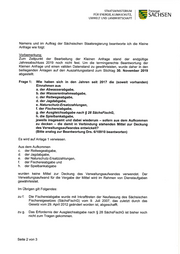 STAATSMINISTERIUM FÜR ENERcIE, KLIMASCHUTZ, UIVIWE UI' UND LANDWIRTSCHAFT 5 Freistaat SACHSEN Namens und im Auftrag der Sächsischen Staatsregierung beantworte ich die Kleine Anfrage wie folgt: Vorbemerkunq: Zum Zeitpunkt der Bearbeitung der Kleinen Anfrage stand der endgültige Jahresabschluss 2019 noch nicht fest. Um die termingerechte Beantwortung der Kleinen Anfrage und einen validen Datenstand zu gewährleisten, wurde daher in den beiliegenden Anlagen auf den Auszahlungsstand zum Stichtag 30. November 2019 abgestellt. Frage 1: Wie haben sich in den Jahren seit 2017 die (soweit vorhanden) Einnahmen aus a. der Abwasserabgabe, b. der Wasserentnah meabgabe, c. der Reitwegeabgabe, d. der Jagdabgabe, e. N atu rsch utz-Ersatzzah I u n gen, f. der Fischereiabgabe, g. der Ausgleichsabgabe nacfi g 28 SächsFischG, h. die Spielbankabgabe, jeweils insgesamt und dabei wiederum - sofern aus dem Aufkommen zu decken - die damit in Verbindung stehenden Mittel zur Deckung des Verwaltu n gsaufwandes entwickelt? (Bitte analog zur Beantwortung Drs. 6/10910 beantworten) Es wird auf Anlage 1 verwiesen Aus dem Aufkommen c. der Reitwegeabgabe, d. der Jagdabgabe, e. der Naturschutz-Ersatzzahlungen, f. der Fischereiabgabe und h. der Spielbankabgabe wurden keine Mittel zut Deckung des Veruvaltungsaufirvandes venruendet. Der Verwaltungsaufirvand für die Vergabe der Mittel wird im Rahmen von Dienstaufgaben gewährleistet. lm Übrigen gilt Folgendes: zuf . Die Fischereiabgabe wurde mit lnkrafttreten der Neufassung des Sächsischen Fischereigesetzes (SächsFischG) vom 9. Juli 2007, das zuletzt durch das Gesetz vom 29. April2012 geändert worden ist, abgeschafft. zu g. Das Erfordernis der Ausgleichsabgabe nach $ 28 SächsFischG ist bisher noch nicht zum Tragen gekommen. Seite 2 von 3