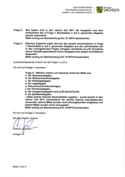 STAATSIVIINISTERIUM Freistaat FÜR ENERGIE, KLI]\4ASCHUTZ, SACHSEN U]\4WELT UND IANDWIRTSCHAFT Frage 2: Wie haben sich in den Jahren seit 2017 die Ausgaben aus dem Aufkommen der in Frage 1, Buchstaben a. bis h. genannten Abgaben jeweils entwickelt? (Bitte analog zur Beantwortung Drs. 6/ 10910 beantworten) Frage 3: Welches Ergebnis ergibt sich bei den jeweils verschiedenen in Frage 1, Buchstaben a. bis h. genannten Abgaben aus den Jahressalden der in den vorangehenden Fragen erfragten Umstände (m.a.W. Einnahme minus Verwaltungsaufwand minus Ausgabe) zum jüngst ermittelbaren Zeitpunkt? (Bitte analog zur Beantwortung Drs. 6/10910 beantworten) Zusammenfassende Antwort auf die Fragen 2 und 3: Es wird auf Anlage 1 venviesen Frage 4: Welcher relative und absolute Anteil der Mittel aus a. der Abwasserabgabe, b. der Wasserentnahmeabgabe, c. der Reitwegeabgabe, d. der Jagdabgabe, e. Nafursc h u tz- E rsatzz ah I u n g e n, f. der Fischereiabgahe, g. der Ausgleichsabgahe nach g 28 SächsFischG, h. die Spielbankabgabe, - dabei jeweils Zweckel Haushaltstitel angeben - wurde jeweils in den Jahren seit 2017 nachweislich für welche Zwecke zweckgebunden verwendet, welche Mittel wurden nicht zweckgebunden eingesetzt und welche Mittel wurden nicht verausgabt? (Bitte analog zur Beantwortung Drs. 6/10910 beantworten) Es wird auf Anlage 2 venruiesen n ßen Anlagen Seite 3 von 3