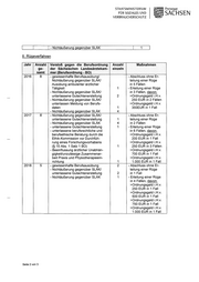 STAATSMlNlSTERlUM Freistaat FÜR SOZlAlES UND VERBRAUCHERSCHUTZ SACHSEN 1 - Nichtäußerung gegenüber SLÄK 1 11. Rügeverfahren Jahr Anzahl Verstoß gegen die Berufsordnung Anzahl Maßnahmen ge- der Sächsischen landesärztekam- einzeln samt mer {Berufsordnung - BO) 2016 8 - gewissenhafte Berufsausübung/ - Abschluss ohne Er- Nichtäußerung gegenüber SLÄK/ teilung einer Rüge Ausübung ambulanter ärztlicher in 5 Fällen Tätigkeit 1 - Erteilung einer Rüge - Nichtäußerung gegenüber SLÄK/ in 3 Fällen, davon: unterlassene Gutachtenerstellung 2 >Ordnungsgeld i.H.v. - Nichtäußerung gegenüber SLÄK/ 250 EUR in 2 Fällen unterlassen Meldung von Berufs- >Ordnungsgeld i.H.v. daten 1 350EUR in 1 Fall - Nichtäußerung gegenüber SLÄK 4 2017 8 - Nichtäußerung gegenüber SLÄK/ - Abschluss ohne Er- unterlassene Gutachtenerstellung 1 teilung einer Rüge - Nichtäußerung gegenüber SLÄK 4 in 2 Fällen - unterlassene Gutachtenerstellung 1 - Erteilung einer Rüge - unterlassene berufsrechtliche und in 6 Fällen, davon: berufsethische Beratung durch die >Ordnungsgeld i.H.v. Ethik-Kommission vor Durchfüh- 200 EUR in 1 Fall rung eines Forschungsvorhabens >Ordnungsgeld i.H.v. (§ 15 Abs. 1 Satz 1 BO) 1 250 EUR in 3 Fällen - Beeinflussung ärztlicher Unabhän- >Ordnungsgeld i.H.v. gigkeit/unzulässige Zusammenar- 700 EUR in 1 Fall beit Praxis und Physiotherapieein- >Ordnungsgeld i.H.v. richtung 1 1.000 EUR in 1 Fall 2018 5 - gewissenhafte Berufsausübung 2 - Abschluss ohne Er- - Nichtäußerung gegenüber SLÄK/ teilung einer Rüge unterlassene Gutachtenerstellung 2 in 1 Fall - Nichtäußerung gegenüber SLÄK 1 - Erteilung einer Rüge in 4 Fällen, davon: >Ordnungsgeld i.H.v. 250 EUR in 1 Fall >Ordnungsgeld i.H.v. 500 EUR in 1 Fall >Ordnungsgeld i.H.v. 750 EUR in 1 Fall >Ordnungsgeld i.H.v. 1.000 EUR in 1 Fall Seite 2 von 3