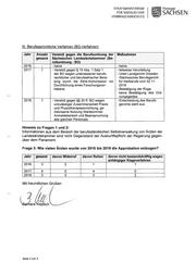 STAATSMlNlSTERlUM Freistaat FÜR SOZlALES UND VERBRAUCHERSCHUTZ SACHSEN III. Berufsgerichtliche Verfahren (BG-Verfahren) Jahr Anzahl Verstoß gegen die Berufsordnung der Maßnahmen gesamt Sächsischen Landesärztekammer (Be- rufsordnung - BO) 2016 - - keine - keine 2017 1 - Verstoß gegen § 15 Abs. 1 Satz 1 - teilweise Verurteilung der BO wegen unterlassener berufs- - Urteil Landgericht Dresden rechtlicher und berufsethischer Bera- /Sächsisches Berufsgericht tung durch die Ethik-Kommission vor für Heilberufe vom 02.11. Durchführung eines Forschungsvor- 2018 habens - Bestätigung der Rüge, keine Bestätigung des Ord- nunqsqeldes 2018 1 - Verstoß gegen §§ 30 ff. BO wegen - Entscheidung des Berufs- unzulässiger Zusammenarbeit Praxis gerichts steht aus und Physiotherapieeinrichtung; ge- meinsame Nutzung Wartezimmer, Anmeldebereich und Beanspruchung des gleichen Personals Hinweis zu Fragen 1 und 2: Informationen aus dem Bereich der berufsständischen Selbstverwaltung von Ärzten der Landesärztekammer sind nicht Gegenstand der Auskunftspflicht der Regierung gegen- über dem Parlament. Frage 3: Wie vielen Ärzten wurde von 2016 bis 2018 die Approbation entzogen? Jahr gesamt davon Widerruf davon Ruhen davon nicht bestandskräftig wegen anhängiger Klageverfahren 2016 3 2 1 1 2017 4 0 4 0 2018 3 0 3 2 Mit freundlichen Grüßen U,.,::L/ Seite 3 von 3