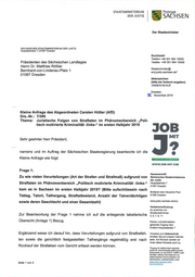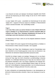 STAATSI\4 STER'I U I\4 Freistaat U IN I DER JUSTIZ SACHSEN ln der Übersicht sind daher auch diejenigen Verurteilungen dargestellt, deren Rechts- kraft erst nach Beantwortung der Kleinen Anfrage mit der Drs.-Nr. 6116310 bekannt geworden ist. lm ersten Halbjahr 2019 wurden - einschließlich der Nachmeldungen für das zweite Halbjahr 2018 - insgesamt 34 Personen aufgrund von Straftaten im Phänomenbereich ,,Pol itisch motivierte Krimi nal ität - lin ks" (rechtskräftig ) veru rtei lt. Frage 2= ln wie vielen Fällen wurden aus welchen Gründen im ersten Halbjahr 2019 Ermitt- lungen zu Straftaten im o.g. Phänomenbereich in Sachsen eingestellt? (Bitte auf- schlüsseln nach Tattag, Tatort, Tathergang, Straftatbestand und Anzahl der Tat- verdächtigen sowie deren Geschlecht und einer Gesamtzahl) Zur Beantwortung der Frage 2 nehme ich auf die anliegende tabellarische Übersicht (Anlage 2) Bezug. lm ersten Halbjahr 2019 wurden insgesamt 320 Ermittlungsverfahren zu Straftaten im Phänomenbereich,, Politisch motivierte Krim inalität - l in ks" eingestellt. Die Teilfragen nach Tattag, Tatort, Straftatbestand, Anzahl der Tatverdächtigen sowie deren Geschlecht und den Einstellungsgründen konnten über eine Recherche in den Datenbanken der sächsischen Staatsanwaltschaften beantwortet werden. Hinsichtlich der erfragten Angaben zum jeweiligen Tathergang wird von einer Beant- wortung der Frage wegen des hierfür erforderlichen unverhältnismäßigen Aufruandes abgesehen. Zur vollständigen Beantwortung der Frage wäre eine händische Auswer- tung sämtlicher Papierakten zu den in der Anlage 2 aufgeführten 320 Vorgängen erfor- derlich. Dies wäre nur mit einem unverhältnismäßigen Auñrand möglich, der ohne den Verlust der Funktionsfähigkeit der Staatsanwaltschaften in der für die Beantwortung der Kleinen Anfrage zur Verfügung stehenden Frist nicht zu leisten wäre. Es wären umfangreiche und zeitauñryendige Recherchen in den Aktenbeständen der sächsischen Staatsanwaltschaften erforderlich. Dabei ist der Zeitaufwand für das Zie- Seite 2 von 3