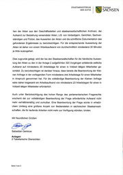 STAATSMINISTERIUIVI DER JUSTIZ t Freistaat SACHSEN hen der Akten aus den Geschäftsstellen und staatsanwaltschaftlichen Archiven, der Aufwand zur Beiziehung versendeter Akten, z.B. von Verteidigern, Gerichten, Sachver- ständigen und Polizei, das Auswerten der Akten und die schriftliche Dokumentation des gefundenen Ergebnisses zu berücksichtigen. Für die entsprechende Auswertung der Akten ist daher von einem Arbeitsaufr¡rand von durchschnittlich mindestens 30 Minuten je Akte auszugehen. Dies zugrunde gelegt, wird der bei den Staatsanwaltschaften für die händische Auswer- tung der Akten zu den in der Anlage 2 aufgeführten 320 Vorgängen anfallende zeitliche Aufwand auf mindestens 20 Arbeitstage für einen in Vollzeit tätigen Mitarbeiter ge- schätzt. Zu berücksichtigen ist darüber hinaus, dass bereits die Beantwortung der Klei- nen Anfrage in der vorliegenden Form mindestens drei Arbeitstage für einen Mitarbeiter in Anspruch genommen hat. Für die vollständige Beantwortung der Kleinen Anfrage wäre daher insgesamt ein Arbeitsaufrrand von mindestens 23 Arbeitstagen für einen in Vollzeit tätigen Mitarbeiter erforderlich. Auch unter Berücksichtigung des hohen Rangs des parlamentarischen Fragerechts erscheint der zur vollständigen Beantwortung der Frage erforderliche Auñ,vand nicht mehr verhältnismäßig und zumutbar. Eine Beantwortung der Frage würde in erhebli- chem Umfang eine größere Anzahl von Bediensteten in sächsischen Staatsanwalt- schaften, die für laufende Arbeiten nicht mehr zur Verfügung stünden, binden. Mit freundlichen Gri.ißen Sebastian Gemkow Anlagen 2 Tabellarische Übersichten Seite 3 von 3