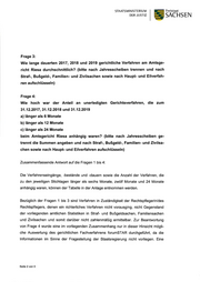 STAATSTMINISTERIU]\4 DER JUSTIZ 5 Freistaat SACHSEN Frage 3: Wie lange dauerten 2017,2018 und 2019 gerichtliche Verfahren am Amtsge- richt Riesa durchschnittlich? (bitte nach Jahresscheiben trennen und nach Straf-, Bußgeld-, Familien- und Zivilsachen sowie nach Haupt- und Eilverfah- ren aufschlüsseln) Frage 4: Wie hoch war der Anteil an unerledigten Gerichtsverfahren, die zum 31.12.20',7, 31.',2.20'18 und 31.12.2019 a) länger als 6 Monate b) länger als 12 Monate c) länger als 24 Monate beim Amtsgericht Riesa anhängig waren? (bitte nach Jahresscheiben ge- trennt die Summen angeben und nach Straf-, Bußgeld-, Familien- und Zivilsa- chen sowie nach Haupt- und Eilverfahren aufschlüsseln) Zusammenfassende Antwort auf die Fragen 1 bis 4 Die Verfahrenseingänge, -bestände und -dauern sowie die Anzahl der Verfahren, die zu den jeweiligen Stichtagen länger als sechs Monate, zwölf Monate und 24 Monate anhängig waren, können der Tabelle in der Anlage entnommen werden. Bezüglich der Fragen 1 bis 3 sind Verfahren in Zuständigkeit der Rechtspflegerin/des Rechtspflegers, denen ein richterliches Verfahren nicht vorausging, nicht Gegenstand der vorliegenden amtlichen Statistiken in Straf- und Bußgeldsachen, Familiensachen und Zivilsachen und somit darüber nicht zahlenmäßig ermittelbar. Zur Beantwortung von Frage 4 wurde eine im vorliegenden Zusammenhang nur in dieser Hinsicht mögli- che Auswertung des gerichtlichen Fachverfahrens forumSTAR durchgeführt, da die lnformationen im Sinne der Fragestellung der Staatsregierung nicht vorliegen. Eine Seite 2 von 5
