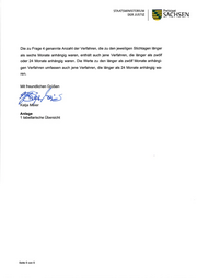 STAATSN4INISTERIUM Freistaat DER JUSTIZ IU SACHSEN Die zu Frage 4 genannte Anzahl der Verfahren, die zu den jeweiligen Stichtagen länger als sechs Monate anhängig waren, enthält auch jene Verfahren, die länger als zwölf oder 24 Monate anhängig waren. Die Werte zu den länger als zwölf Monate anhängi- gen Verfahren umfassen auch jene Verfahren, die länger als 24 Monate anhängig wa- ren. Mit freundlichen ßen ; M r Anlage 1 tabellarische Übersicht Seite 5 von 5