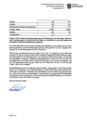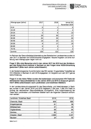 STAATSM1N1STER1UM FLJR SOZ1ALES Freistaat UND GESELLSCHAFTL10-1EN SACHSEN ZUSAMMENHALT Alt e r s g r up p e ( J a hr e ) 2017 2018 J a nua r b is Novem ber 2019 0-14 0 1 0 15-19 1 2 2 20-24 5 9 13 25-29 29 30 17 30-39 34 33 43 40-49 19 25 21 50-59 9 17 19 60-69 6 3 5 70-79 0 2 0 Sum m e 103 122 120 I m R a hm e n d e r G e s und he i t s b e r i c ht e r s t a t t ung d e s S t a t i s t i s c he n L a nd e s a m t e s w ur d e n i m Jahr 2017 in Sachsen fünf AIDS-Erk rank te angegeben. Neuere Angaben und eine Auf- teilung nach Altersgruppen liegen nicht vor. Fr a g e 3: W i e v i el e Men s c h en s i n d i n d en J a h r en 2017 b i s 2019 l a u t d en Sc h ät zu n - g en d es Ro b er t -K o c h -In s t i t u t s i n Sa c h s en a n d en Fo l g en ei n er A IDS-Er k r a n k u n g g est o r b en? (B it t e nac h J ahr en auf sc hlü sselnl) In der Epidem iologischen Kurzinform ation des RKI werden 15 geschätzte Todesfälle bei H IV - Inf izie r t e n in S a c hs e n im J a hr 2 0 1 8 a ng e g e b e n. Im V e r g le ic h zum J a hr 2 0 1 7 g a b e s k eine Änderung. Fr a g e 4: In w i e v i el en Fäl l en w u r d en d i e k o s t en l o s en u n d a n o n y m en HIV-T es t s d er säc hsisc hen Gesund heit säm t er in d en J ahr en 2018 und 2019 in Ansp r uc h g eno m - m en? (B it t e auf sc hlü sseln nac h L and k r eisen und k r eisf r eien St äd t en1) In der Landesuntersuchungsanstalt für das Gesundheits- und Veterinärwesen in Sach- sen wurden in den Jahren 2018 und 2019 insgesam t 7.354 bzw. 7.494 HIV-Tests im Auftrag der sächsischen Gesundheitsäm ter durchgeführt. Eine Aufschlüsselung der Tests nach Landk reisen und Kreisfreien Städten k ann der folgenden Übersicht entnom - m en werden. L a nd k r e is / K r e is f r e ie S t a d t 2018 2019 Chem nitz, Stadt 908 895 Erzgebirgsk reis 81 58 Mittelsachsen 37 45 Vogtlandk reis 99 84 Zwick au 82 41 Dresden, Stadt 2.996 3.237 Bautzen 24 50 Seite 2 von 3