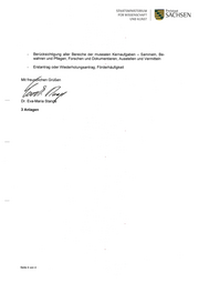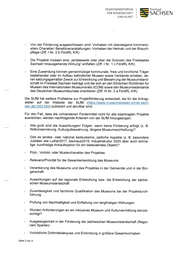 STAATSMINISTERIUM Freistaat FÜR WISSENSCHAFT SACH SEIN UND KUNST Berücksichtigung aller Bereiche der musealen Kernaufgaben - Sammeln, Be wahren und Pflegen, Forschen und Dokumentieren, Ausstellen und Vermitteln Erstantrag oder Wiederholungsantrag, Förderhäufigkeit Mit freupdtichen Grüßen Dr. Eva-Maria Stanc 3 Anlagen Seite 4 von 4