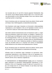 STAATSIVI IN I ST E RI U IVI DER JUSTIZ t Freistaat SACHSEN Verurteilungen auf Grund von Strafbefehlen sowie die gerichtlich festgestellten Tather- gänge können regelmäßig erst nach Rücklauf der Strafakten vom Gericht erfasst wer- den. Mit dieser Maßgabe haben die Staatsanwaltschaften im Freistaat Sachsen fol- gende Verurteilungen berichtet: lm Zuständigkeitsbereich der Staatsanwaltschaft Dresden wurden zwei männliche Heranwachsende verurteilt. Ein Heranwachsender wurde wegen Landfriedensbruchs in zwei Fällen, hiervon in einem Fall in Tateinheit mit zwei tateinheitlichen Fällen der Kör- perverletzung, zu einer Einheitsjugendstrafe in Höhe von zehn Monaten verurteilt. Die Vollstreckung wurde zur Bewährung ausgesetzt. Der zweite Heranwachsende wurde wegen Landfriedensbruchs in zwei Fällen zu einer Einheitsjugendstrafe von zehn Mo- naten verurteilt, deren Vollstreckung zut Bewährung ausgesetzt wurde. Beide Verurteil- te nahmen an den Ausschreitungen in Heidenau am22. August 2015 von insgesamt ca. 100 Teilnehmern teil, wobei es insbesondere auch zu Angriffen auf Polizeibeamte kam. Außerdem marschierten die Verurteilten am 11. Januar2016 in Leipzig mit einer Gruppierung aus dem rechten Spektrum, aus der heraus Gewalttätigkeiten gegen La- dengeschäfte und Fahrzeuge im Stadtteil Connewitz begangen wurden. Bei der Verurteilung wurde das politische Tatmotiv gemäß $ 46 Absatz 2 Satz 2 StGB festgeste lt u n d strafschä rfend be rü cks ichti gt. I Ein männlicher Emrachsener wurde u.a. wegen Ven¡¡endens von Kennzeichen verfas- sungswidriger Organisationen zu einer Gesamtfreiheitsstrafe in Höhe von drei Monaten verurteilt. Die Vollstreckung wurde zur Bewährung ausgesetzt. Der Verurteilte erhob am 27. Mai 2018 in Dresden seinen linken Arm zum Hitlergruß und rief laut ,,Sieg Heil". Bei der Verurteilung wurde das politische Tatmotiv gemäß $ 46 Absatz 2 Satz 2 StGB festgestel lt u nd strafschärfend berücksichti gt. lm Zuständigkeitsbereich der Staatsanwaltschaft Görlitz wurde ein männlicher Er- wachsener u.a. wegen Ven¡rendens von Kennzeichen verfassungswidriger Organisati- onen und gefaihrlicher Körperverletzung zu zwei Gesamtfreiheitsstrafen von jeweils neun Monaten verurteilt. Die Vollstreckung wurde jeweils zur Bewährung ausgesetzt. Seite 2 von 7