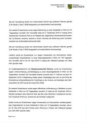 T STAATSI\4INISTERIUNI Freistaat DER JUSTIZ SACHSEN Bei der Verurteilung wurde vom erkennenden Gericht das politische Tatmotiv gemäß g 46 Absatz2 Satz 2 StGB festgestellt und strafschärfend berücksichtigt. Ein weiterer Erwachsener wurde wegen Bedrohung zu einer Geldstrafe in Höhe von 40 Tagessätzen verurteilt. Der Verurteilte hatte am 5. September 2018 in Leipzig einen bedrohenden Facebook-Post an ein Mitglied des,,Allgemeinen Studentenausschusses" der Uni Bremen versandt, welches in einem lnterview die Entlarvung einer Lehramts- studentin als rechtsradikal befünuortet hatte. Bei der Verurteilung wurde vom erkennenden Gericht das politische Tatmotiv gemäß $ 46 Absatz2 Satz 2 StGB festgestellt und strafschärfend berücksichtigt. Letztlich wurde ein Enrachsener u.a. wegen Venryendens von Kennzeichen verfas- sungswidriger Organisationen zu einer Gesamtgeldstrafe in Höhe von 140 Tagessät- zen verurteilt, weil er am 20. April 2018 in Leipzig den Hitlergruß gezeigt und,,Sieg Heil" gerufen hatte. lm Zuständigkeitsbereich der Staatsanwaltschaft Zwickau wurde ein Enryachsener wegen Volksverhetzung und Beleidigung zu einer Gesamtgeldstrafe in Höhe von 85 Tagessätzen verurteilt. Der Verurteilte forderte zwischen dem 17. Februar und dem 19. September 2018 in Waldenburg mittels zweier Textbeiträge über sein vk.com-Profil die Erschießung schwarzafrikanischer Fluchtlinge an der Grenze und beleidigte zwei Spit- zenpolitiker der SPD sowie der Partei DIE LINKE. Ein weiterer Enruachsener wurde wegen öffentlicher Aufforderung zu Straftaten zu einer Geldstrafe in Höhe von 55 Tagessätzen verurteilt. Er hatte am 26. November 2018 in Zwickau bezüglich einer Nachricht über den Bau einer Moschee in Kaufbeuren auf sei- nem Facebook-Profil zum,,Anbrennen die Scheiße!" aufgerufen. Zudem wurde ein Enuachsener wegen Verwendens von Kennzeichen verfassungswid- riger Organisationen zu einer Geldstrafe in Höhe von 15 Tagessätzen verurteilt, weil er am 25. Mai 2019 aus dem Fenster einer Wohnung in Plauen den Hitlergruß gezeigt und ,,Heil Hitler" gerufen hatte. Seite 5 von 7