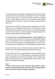 T STAATSMINISTERIUM Freistaat DER JUSTIZ SACHSEN Ein weiterer Emrachsener erhielt wegen Volksverhetzung eine Ven¡rarnung mit Straf- vorbehalt hinsichtlich einer Verurteilung zu einer Geldstrafe in Höhe von 30 Tagessät- zen. Der Verurteilte stellte am 2. Januar 2018 in Mülsen auf seinem Facebook-Profil bezüglich des ersten Kindes des Jahres in Wien mit muslimischen Eltern folgenden ausländerfeindlichen Kommentar ein: ,,Bitte sofort zurückficken und abtreiben oder ab nach Hause". Schließlich wurde ein männlicher Envachsener wegen Volksverhetzung zu einer Geld- strafe in Höhe von 15 Tagessätzen verurteilt, weil er am 27. August 2018 aus seiner Reinsdorfer Wohnung über seinen Facebook-Account zu den Demonstrationsereignis- sen in Chemnitz mit Hinweisen zu massiven Übergriffen auf Migranten folgenden Post gesetzt hat: ,,Jagt das Gesindel aus unseren Städten!!!1". I m Zuständig keitsbereich der Generalstaatsanwaltschaft - Abtei I ung llI/ZESA wu rde ein Erwachsener wegen Verwendens von Kennzeichen verfassungswidriger Organisa- tionen zu einer Geldstrafe in Höhe von 50 Tagessätzen verurteilt. Der Verurteilte hatte am 27. August 2018 im Rahmen des Versammlungsgeschehens in Chemnitz im Zu- sammenhang mit dem Tötungsdelikt beim Chemnitzer Stadtfest den Hitlergruß gezeigt. Bei dieser Verurteilung wurde vom erkennenden Gericht das politische Tatmotiv ge- mäß $ 46 Absatz 2 Satz 2 StGB festgestellt und strafschärfend berücksichtigt. Die Verurteilungen, bei denen vom jeweils erkennenden Gericht das politische Tatmo- tiv gemäß $ 46 Absatz 2 Satz 2 StGB festgestellt und strafschärfend berücksichtigt wurde, sind ausgewiesen. Bei den übrigen Verurteilungen wurde vom jeweils erken- nenden Gericht das politische Tatmotiv gemäß $ 46 Absatz 2 Satz 2 StGB nicht fest- gestellt und strafschärfend berücksichtigt Frage 3: ln welchen Fällen wurden aus welchen Gründen im Monat September 2019 Er- mittlungen eingestellt (aufgeschlüsselt nach Tattag, Tatort, Tathergang, Straftat- bestand und Anzahl der Personen sowie deren Geschlecht)? Seite 6 von 7