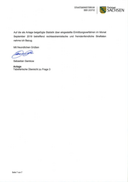 IT STAATSMINISTERIUM Freistaat DER JUSTIZ SACHSEN Auf die als Anlage beigefügte Statistik über eingestellte Ermittlungsverfahren im Monat September 2019 betreffend rechtsextremistische und fremdenfeindliche Straftaten nehme ich Bezug. Mit freundlichen Grüßen Sebastian Gemkow Anlage Tabellarische Übersicht zu Frage 3 Seite 7 von 7