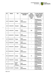 STAATSMINISTERIUM Freistaat DESINNERN SACHSEN Nr. Datum Ort Veranstaltungl links- Art der Aktivität Aktivität extremis- und ggf. Veran- tische Teil- stalter (sofern nehmer- bekannt) zahl Beteiligung an 54 29.10.2019 Dresden “iCht . . * “iChteXtremiSti' extremlstlsch scher Demonstration nicht Beteiligung an 55 30.10.2019 Zittau extremistisch * nichtextremisti- schem Konzert nicht * Beteiligung an 56 06112019 Dresden extremistisch Protestaktion(en) nicht Beteiligung an 57 08.11.2019 Dresden extremistisch * nicht extremisti- schem Konzert Beteiligung an 58 17.11.2019 Leipzig “'Cht . . 100 “'ChteXtrem'St" extremlstlsch scher Demonstration . Beteiligung an 59 20.11.2019 Dresden nlcht . . * Vortragsveran- extremlstlsch staltung nicht * Beteiligung an 60 20'11'2019 Dresden extremistisch Protestaktion(en) . Beteiligung an 61 22.11.2019 55232: ;‘fifr‘émisfisch * nicht extremisti- g schem Konzert nicht Beteiligung an 62 23.11.2019 Chemnitz .. * nichtextremisti- extremistlsch schem Konzert Beteiligung an . . nicht * nicht extremisti— 63 23'11'2019 LeIpZIg extremistisch scher Demonstration Beteiligung an . . nicht * nichtextremisti— 64 24'11'2019 LeIpZIg extremistisch scher Demonstration . nicht * Beteiligung an 65 27'11'2019 Chemmtz extremistisch Kundgebung 66 01.12.2019 linksextremis- Beteiligung an Leipzig . * Vortragsveran- hsch staltung Beteiligung an . . nicht ‚. nichtextremisti- 67 13'12'2019 LBIpZIQ extremistisch scher Demonstration Seite 7 von 9