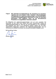 STAATSIVIINISTERIUM Freistaat FÜR ENERGIE, KLIIVIASCHUTZ, SACHSEN UIUWELT UND TANDWIRTSCHAFT Frage 5: Wie begründet die Staatsregierung die Ausweitung der Ausnahme- regelung nach $ 45 Absatz 7 Satz 1 Nummer 5 des Bundesnatur- schutzgesetzes auf Jagdausübungsberechtigte in der SächsWolfMVO, obwohl der Bundesgesetzgeber ausdrücklich im Falle von besonders geschützten, nicht jagdbaren Tieren auf die tiermedizinische Kom petenz von ausgebi ldeten Veteri nären abstel lt? Die Befugnisse der Jagdausübungsberechtigten sind auf einen speziellen Fall beschränkt, auf das Töten eines Wolfes nach einem Verkehrsunfall. Schätzt der Jagdausübungsberechtigte ein, dass das Tier nicht lebensfähig ist und in absehbarer Zeit versterben wird, kann er zur Vermeidung weiteren Leidens das Tier töten. Jagdrechtliche Regelungen verpflichten den Jagdausübungsberechtigten dies zur Vermeidung vermeidbarer Schmerzen und Leid auch bei anderen Wildarten zu tun. Mit freundlich Grüßen t lfram ther Seite 3 von 3
