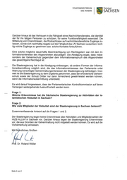 STAATSMiNiSTERiUM Freistaat DES iNNERN SACHSEN Der Staatsminister SÄCHSISCHES STAATSMINISTERIUM DES INNERN Aktenzeichen 01095 Dresden (bitte bei Antwort angeben) 16-0141.50/3724 Präsidenten des Sächsischen Landtages Dresden, 3. Dezember 2019 Herrn Dr. Matthias Rößler Bernhard-von-Lindenau-Platz 1 01067 Dresden Kleine Anfrage des Abgeordneten Carsten Hütter (AfD) Drs.-Nr.: 7/450 Thema: Aktivitäten von Hisbullah in Sachsen Sehr geehrter Herr Präsident, namens und im Auftrag der Sächsischen Staatsregierung beantworte ich die Kleine Anfrage Wie folgt: Vorbemerkung: Der FragestellervenNendet in der Kleinen Anfrage die Begriffe „Hisbullah“ und „islamistische Hisbullah". Für die Beantwortung wird darauf hingewiesen, dass die Verfassungsschutzbehörden die Iibanesische HIZB ALLAH und die TÜRKISCHE HIZBULLAH beobachten. Es wird auf die Vorbemerkung in der Antwort der Staatsregierung auf die Kleine Anfrage Drs.-Nr. 6/13602 verwie- sen. Der Staatsregierung liegen Erkenntnisse vor, deren Mitteilung überwiegende Belange des Geheimschutzes (Art. 51 Abs. 2 Verfassung des Freistaates Sachsen [SächsVerf]) entgegenstehen. Es handelt sich dabei um Informatio- nen, die gemäß Nummer 8 in Verbindung mit den Nummern 3.3 der Verwal- tungsvorschrifl der Sächsischen Staatsregierung über die Behandlung von Verschlusssachen vom 4. Januar 2008 (SächsABI. Sonderdruck Jg. 2008) als Verschlusssache eingestuft wurden. Die Einstufung ist zur Sicherstellung der Funktionsfähigkeit des Landesamtes für Verfassungsschutz (LfV) Sachsen und zum Schutz nachrichtendienstlicher Zugänge erforderlich. Die informati- onen sind durch nachrichtendienstliche Mittel (§ 5 Abs. 1 Gesetz über den Verfassungsschutz im Freistaat Sachsen [SächsVSG]) erlangt worden. Die Hausanschrift: Weitergabe dieser Informationen würde die eingesetzten Methoden der Sächsisches Staatsministerium Nachrichtenbeschaffung offenbaren oder Rückschlüsse auf die Art nachrich- des lnnern tendienstiicher Zugänge ermöglichen und somit die Arbeitsfähigkeit des LfV WilheIm-Buck-Str. 2 01097 Dresden Sachsen gefährden. Im Falle des Einsatzes von Personen nach § 5 Abs. 1 SächsVSG stehen zudem Rechte Dritter im Sinne von Art. 51 Abs. 2 Sächs- Telefon +49 351 564-0 Telefax +49 351 564-3199 Verf entgegen. Diese Personen wären bei einer Mitteilung in ihren Grundrech- www.smi.sachsen.de ten auf Leben, körperliche Unversehrtheit und Freiheit der Person gefährdet. Die Staatsregierung trifft eine Schutzpflicht gegenüber diesen Personen, wes- Verkehrsanbindung: Zu erreichen mit den Straßen- halb sie insoweit jegliche Handlungen zu unterlassen hat, die zu deren Ent- bahnlinien 3, 6, 7, 8, 13 tarnung führen könnten. Besucherparkplätze: Bine beim Empfang Wilhelm- Buck-Str. 2 oder 4 melden.