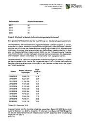 STAATSM1N1STERIM FÜR SOZ1ALES Freistaat UND GESELLSCHAFTUCHEN SACHSEN ZUSAMMENHALT Kalenderjahr Anzahl Verstorbener 2017 80 2018 177 2019 75 2020 58 Frage 3: Wie hoch ist derzeit die Durchimpfungsrate bel Influenza? Eine gesetzliche Meldepflicht über die Durchführung von Schutzimpfungen besteht nicht. Um lmpfraten für die Gesamtbevölkerung des Freistaates Sachsens angeben zu können, wurde seit 2015 eine sächsische lmpfdatenbank eingerichtet. Diese beinhaltet Datenma- terial der seit 2009 über die Kassenärztliche Vereinigung Sachsen (KVS) abgerechneten lmpfungen. Grundlage bildet eine zwischen dem Sächsischen Staatsministerium für Sozi- ales und Gesellschaftlichen Zusammenhalt (SMS) und der KVS geschlossene Vereinba- rung. Nicht enthalten sind die lmpfungen der privat Krankenversicherten. Die diesbezügli- chen lmpfdaten werden nicht erfasst und können daher nicht angegeben werden. Die jeweils absolute Zahl von durchgeführten lnfluenza-lmpfungen pro Saison (1. Septem- ber des Vorjahres bis 28. Februar des Folgejahres) seit 2009/2010 sowie die anhand der Bevölkerungszahlen errechneten lmpfquoten für den Freistaat Sachsen sind in der folgen- den Tabelle aufgelistet: lmpf- Anzahl Influenza- Saison impfungen quote in % 2009/2010 1.568.279 41,8 2010/2011 1.221.597 32,7 2011/2012 1.158.009 31,7 2012/2013 1.107.036 30,4 2013/2014 1.103.448 30,3 2014/2015 1.053.828 28,9 2015/2016 1.035.384 28,2 2016/2017 1.015.821 27,7 2017/2018 1.002.535 27,3 2018/2019 1.076.911 29,3 2019/2020* 1.036.756 28,2 * Stand 31. Dezember 2019 lnsgesamt ergibt sich für die letzte vollständig auswertbare Saison 2018/2019 eine lmpf- quote für Sachsen von 29,3 %, die somit 2 % höher als in der Saison 2017/2018 liegt. Für die aktuelle Saison errechnet sich mit Datenstand vom 31. Dezember 2019 eine bisherige lmpfquote von 28,2 %. Sete 2 von 3
