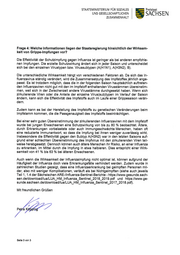 STAATSM1N1STER1UM FÜR SOZ1ALES UND GESELLSCHAFTUCHEN FÄalt—ISEN ZUSAMMENHALT Die Staats m inis ter in SACHSISCHES STAATSMINISTERIUM FÜR SOZIALES UND GESELLSCHAFTLICHEN ZUSAMMENHALT Durchwahl Albertstraße 10101097 Dresden Telefon +49 351 564-55000 Telefax +49 351 564-55010 Präsidenten des Sächsischen Landtages Herrn Dr. Matthias Rößler Ihr Zeichen Bernhard-von-Lindenau-Platz 1 01067 Dresden lhre Nachricht vom Aktenzeichen (bitte bei Antwort angeben) 23-0141.51-20/244 Dresden, K l ei n e A n f r a g e d er A b g eo r d n et en Su s a n n e Sc h a p er (DIE L INK E) , Juli 2020 Dr s.-Nr .: 7/2710 T h em a : In f l u en za -Er k r a n k u n g en u n d T o t e d u r c h In f l u en za v o n 2017 b i s 2020 in Sac hsen S e hr g e e hr t e r H e r r P r ä s id e nt , nam ens und im Auftrag der Sächsischen Staatsregierung beantworte ich die K le ine Anf r a g e wie f o lg t : Fr age 1: Wie viele Influenza-Er kr ankungen tr aten in der Winter saison 2017/2018, 2018/2019 und 2019/2020 auf ? Der Landesuntersuchungsanstalt für das Gesundheits- und Veterinärwesen (LUA) Sachsen wurden von den Gesundheitsäm tern in den j eweiligen Saisons folgende lnfluenza-Erk rank ungen gem äß § 1 Ziffer 10 Verordnung des Sächsi- schen Staatsm inisterium s für Soziales und Verbraucherschutz über die Erwei- terung der Meldepflicht für übertragbare Krank heiten und Krank heitserreger nach dem lnfek tionsschutzgesetz (IfSGMeldeVO) gem eldet: Saison Erkrankungen 2017/2018 47.765 2018/2019 22.642 2019/2020 20.641 Saison: jeweils 40. Kalenderwoche des Vorjahres bis einschließlich 17. Kalen- derwoche des Folgejahres Frage 2: Wie viele Menschen sind in den letzten drei Jahren an einer In- fluenza bzw. deren Folgen verstorben (bitte nach Jahresscheiben auf- schlüsseln)? Hausanschrlft: Die Anzahl der an einer Influenza bzw. den Folgen daran verstorbenen Men- SachsIsches Staatsministerium schen im Freistaat Sachsen zum Stichtag 12. Juni 2020 kann der folgenden für Soziales und Gesellschaft- Übersicht entnommen werden: %hen Zusammenhalt Albertstraße 10 01097 Dresden www.srns.sachsen.de