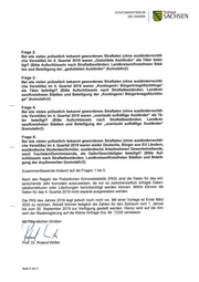 STAATSMiNiSTERiUNI Freistaat DES iNNERN SACHSEN Frage 2: Bei wie vielen polizeilich bekannt gewordenen Straftaten (ohne ausländerrechtli- che Verstöße) im 4. Quartal 2019 waren „Geduldete Ausländer“ als Täter betei- ligt? (Bitte Aufschlüsseln nach Straftatbeständen; Landkreisen/Kreisfreien Städ- ten und Beteiligung der „geduldeten Ausländer“ (kumulativ)!) Frage 3: Bei wie vielen polizeilich bekannt gewordenen Straftaten (ohne ausländerrechtli- che Verstöße) im 4. Quartal 2019 waren „Kontingent-I Bürgerkriegsflüchtlinge“ als Täter beteiligt? (Bitte Aufschlüsseln nach Straftatbeständen; Landkrei- seanreisfreien Städten und Beteiligung der „Kontingent-I Bürgerkriegsfiüchtlin- ge“ (kumulativ)!) Frage 4: Bei wie vielen polizeilich bekannt gewordenen Straftaten (ohne ausländerrechtli- che Verstöße) im 4. Quartal 2019 waren „unerlaubt aufhältige Ausländer“ als Tä- ter beteiligt? (Bitte Aufschlüsseln nach Straftatbeständen; Landkrei- seanreisfreien Städten und Beteiligung der „unerlaubt aufhältige Ausländer“ (kumulativ)!) Frage 5: Bei wie vielen polizeilich bekannt gewordenen Straftaten (ohne ausländerrechtli- che Verstöße) im 4. Quartal 2019 waren weder Deutsche, Bürger aus EU Ländern, ausländische StudentenISchüler, ausländische Arbeitnehmerl Gewerbetreibende, noch TouristenlDurchreisende, als OpferIGeschädigter beteiligt? (Bitte Auf- schlüsseln nach Straftatbeständen; Landkreiseanreisfreien Städten und Beteili- gung der Asylbewerber (kumulativ)!) Zusammenfassende Antwort auf die Fragen 1 bis 5: Nach den Reg eln der Pol ize ili che n Krim inal stat isti k (PK S) sin d die Dat en für das ent- sprechende Jah r kum ula tiv aus zuw eis en, da nur so zwi sch enz eit lic h erf olg te Dat en- satzkorrekturen ode r Lös chu nge n ber ück sic hti gt wer den kön nen . Mit hin kön nen die Daten für das 4. Quartal 2019 nicht separat ausgewiesen werden. Die PK S des Jah res 201 9 lieg t jed och noc h nicht vor. Mit ein er Vor lag e ist End e Mär z 2020 zu rec hne n. Akt uel l kön nen ledi glic h die Zah len für den Zei tra um vom 1. Jan uar bis zum 30. Sep tem ber 201 9 zur Ver füg ung gest ellt wer den . Hie rzu wir d auf die Ant — wort der Staatsregierung auf die Kleine Anfrage Drs.-Nr. 7/235 venNiesen. Mit‘fändlichen Grüßen ” „f @ Pro . Dr. Roland Wöller Seite 2 von 2