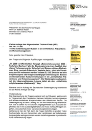 STAATSMINISTERIUM FÜR WISSENSCHAFT KULTUR UND TOURISMUS STAATSMINISTERIUM FÜR WISSENSCHAFT, KULTUR UND TOURISMUS Postfach 10 09 20 | 01079 Dresden Präsidenten des Sächsischen Landtages Herrn Dr. Matthias Rößler Bernhard-von-Lindenau-Platz 1 01067 Dresden Kleine Anfrage des Abgeordneten Thomas Kirste (AfD) Drs.-Nr.: 7/1380 Thema: Einbindung der Museen in ein einheitliches Präventions- und Krisenmanagement Sehr geehrter Herr Präsident, den Fragen sind folgende Ausführungen vorangestellt: „Im 2009 veröffentlichten Konzept „Museumskonzeption 2020 — Kulturland Sachsen“ gibt die Staatsregierung einen Ausblick über die zur Verbesserung der Sicherheit von Museen nötigen Maßnah- men. Eine „zentrale Erkenntnis“ bestehe darin, „dass die Vernet- zung vor Ort verbessert werden“ müsse (S. 125). Denkbar sei eine trägerbezogene oder trägerunabhängige Einbindung der Museen und bewahrenden Kultureinrichtungen in ein „einheitliches Prä- ventions- und Krisenmanagement“. Die Staatsregierung bezeich- net die trägerunabhängige Lösung dabei als den „mittelfristig möglicherweise effektivere[n]“ Weg.“ Namens und im Auftrag der Sächsischen Staatsregierung beantworte ich die Kleine Anfrage wie folgt: Vorbemerkung: Die Beantwortung der Fragen erstreckt sich auf Museen, welche sich in Trägerschaft des Freistaates Sachsen befinden beziehungsweise auf landesunmittelbare Körperschaften des öffentlichen Rechts. Die Staatsregierung ist dem Landtag nur für ihre Amtsführung verantwort- lich. Sie ist daher nur in solchen Angelegenheiten zur Auskunft ver- pflichtet, die in ihre Zuständigkeit fallen und muss nicht auf Fragen ein- gehen, die außerhalb ihres Verantwortungsbereichs liegen. Letzteres ist hier der Fall, denn die Fragen betreffen in großen Teilen Sachverhalte, die von Gemeinden oder Landkreisen als Selbstverwal- tungsaufgabe wahrgenommen werden beziehungsweise in privatrecht- licher Verantwortung liegen. Freistaat SACHSEN Die Staatsministerin für Kultur und Tourismus Aktenzeichen (bitte bei Antwort angeben) KT-L-1053/10/3-2020/3303 Dresden, — ‘5 März 2020 ar Zertifikat seit 2007 audit berufundfamilie Hausanschrift: Staatsministerium für Wissenschaft, Kultur und Tourismus Wigardstraße 17 01097 Dresden (Straßenbahnlinien 3, 6, 7, 8, 13) Staatsministerin für Kultur und Tourismus Königsbrücker Straße 29 01099 Dresden (Straßenbahnlinien 7, 8) Für Besucher mit Behinderungen stehen Parkplätze am jeweiligen Hintereingang zur Verfügung. www.smwk.sachsen.de Der Empfang von elektronisch signierten und verschlüsselten Dokumenten ist via DE-Mail möglich: ministerium@smwk-sachsen.de-mail.de