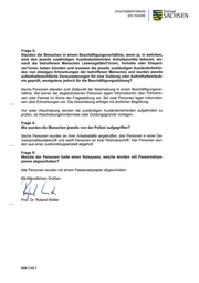 STAATSMINISTERIUM L71 __ Freistaat DES iNNERN ] SACHSEN Frage 3: Standen die Menschen in einem Beschäftigungsverhältnis, wenn ja, in welchem, sind den jeweils zuständigen Ausländerbehörden Anhaltspunkte bekannt, wo- nach die betroffenen Menschen Lebensgefährt*innen‚ Verlobte oder Ehepart- ner*innen haben könnten und wussten die jeweils zuständigen Ausländerbehör- den von etwaigen Erkrankungen der betroffenen Menschen und wurden jeweils aufenthaltsrechtliche Voraussetzungen für eine Duldung oder Aufenthaltserlaub- nis geprüft, wenigstens jedoch für die Beschäftigungsduldung? Sechs Personen standen zum Zeitpunkt der Abschiebung in einem Beschäftigungsver— hältnis. Bei keiner der abgeschobenen Personen lagen Informationen über Partnerin— nen oder Partner im Sinne der Fragestellung vor. Bei zwei Personen lagen Informatio- nen über Erkrankungen vor. Die Abschiebung erfolgte mit ärztlicher Begleitung. Vor jeder Abschiebung werden die zuständigen Ausländerbehörden aufgefordert zu prüfen, ob Abschiebungshindernisse oder Duldungsgründe vorliegen. Frage 4: Wo wurden die Menschen jeweils von der Polizei aufgegriffen? Sechs Personen wurden an ihrer Arbeitsstätte angetroffen, drei Personen in einer Ge- meinschafisunterkunft und zwölf Personen an ihrer Wohnanschrift. Vier Personen wur- den aus einer Justizvollzugsanstalt abgeholt. Frage 5: Welche der Personen hatte einen Reisepass, welche wurden mit Passersatzpa- pieren abgeschoben? Alle Personen wurden mit einem Passersatzpapier abgeschoben. Pro/Dr. Roland Wöller Seite 3 von 3