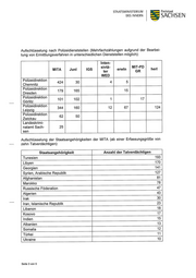 STAATSMINISTERIUM DES INNERN SACH SEN Aufschlüsselung nach Polizeidienststellen (Mehrfachzählungen aufgrund der Bearbei— tung von Ermittlungsverfahren in unterschiedlichen Dienststellen möglich): Inten- sivtä- MlT-PD MITA Junl IGS ter erwln GR herl WED Polizeidirektion Chemnitz 424 30 4 5 Polizeidirektion Dresden 179 165 15 P?IIzleIdIrektIon 101 102 ‚| 17 Gorlltz P°."Z‘?'d”ekt'°“ 344 160 12 67 124 Le|p2|g Pol_|ze|d|rekt|on 62 50 ZWIckau Landeskrimi- nalamt Sach— 25 sen Aufschlüsselung der Staatsangehörigkeiten der MITA (ab einer Erfassungsgröße von zehn Tatverdächtigen): Staatsangehörigkeit Anzahl der Tatverdächtigen Tunesien 193 Libyen 170 Georgien 141 Syrien, Arabische Republik 127 Afghanistan 81 Marokko 78 Russische Föderation 47 Algerien 43 Irak 30 Iran, Islamische Republik 23 Libanon 18 Kosovo 17 Indien 15 Albanien 13 Somalia 12 Türkei 11 Ukraine 10 Seite 3 von 5