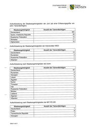 STAATSMlNlSTERlUM DES lNNERN SACH SEN Aufschlüsselung der Staatsangehörigkeiten der Junl (ab einer Erfassungsgröße von zehn Tatverdächtigen): Staatsangehörigkeit Anzahl der Tatverdächtigen Deutschland 387 Syrien, Arabische Republik 20 Russische Föderation 12 Slowakei 11 Afghanistan 10 Aufschlüsselung der Staatsangehörigkeiten der lntensivtäter WED: Staatsangehörigkeit Anzahl der Tatverdächtigen Deutschland Rumänien Russische Föderation Albanien Aufschlüsselung nach Staatsangehörigkeiten der erwln: Staatsangehörigkeit Anzahl der Tatverdächtigen ® Deutschland 0) _.\_x_L_\_\_\_\__x_\w_ßm Rumänien Georgien Libyen Ägypten Syrien Tunesien Irak Russische Föderation Moldau Lettland Algerien Albanien Aufschlüsselung nach Staatsangehörigkeiten der MlT-PD GR: Staatsangehörigkeit Anzahl der Tatverdächtigen —x—\oo\| Deutschland Polen Tschechische Republik Georgien Seite 4 von 5