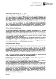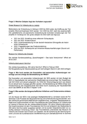 FÜR WISSENSCHAFT STAATSMINISTERIUM KULTUR UND TOURISMUS Frage 3: Welcher Zeitplan liegt den Vorhaben zugrunde? Grassi Museum für Völkerkunde zu Leipzig Meilensteine der Entwicklung im Zeitraum 2020 bis 2023 sollen die Eröffnung der Teil- projekte (Re)inventingGrassi 2023 werden. Von 2020 bis 2021 steht die wissenschaftli- che, gestalterische und planerische Vorbereitung der konkreten Umsetzungen der Teil- projekte im Vordergrund. Der grobe Zeitplan bis 2023 sieht wie folgt aus: «e 2021 bis 2023: Schaffung eines reflexiven Schaudepots «e 2021 bis 2022: Kindermuseum «e 2022: Auseinandersetzung mit der deutsch-deutschen Ethnografie als histori- scher Schwerpunkt «e 2022: Fragestellungen des Postkolonialismus e 2022 bis 2023: Schwerpunkt auf immersive Museumserfahrungen (Sound und Performanz) Museum für Völkerkunde Dresden Die nächste Sonderausstellung „Sprachlosigkeit — Das laute Verstummen“ öffnet am 26.02.2021. Völkerkundemuseum Herrnhut Die Jubiläumsausstellung „300 Jahre Herrnhut“ öffnet im Februar 2022. Die Neugestaltung der Dauerausstellung soll nach jetzigem Stand im Jahr 2023 erfolgen. Frage 4: Wie hoch werden die finanziellen und personellen Aufwendungen ver- schlagt und wie erfolgt die Bereitstellung der Mittel? Die finanziellen und personellen Aufwendungen der SES werden mit dem Budget der SKD im Haushaltsplan der sächsischen Staatsregierung veranschlagt. Der Doppelhaus- halt 2021/2022 wird aktuell aufgestellt. Zur Höhe der Veranschlagung kann aus diesem Grund aktuell keine Aussage getroffen werden. Die Bereitstellung der Mittel erfolgt nach Verabschiedung des Doppelhaushalt 2021/2022 durch Zuweisung der Haushaltsmittel durch das SMWK an die SKD in Kapitel 12 85. Frage 5: Wie werden die bürgerschaftlichen Initiativen und Fördervereine einbezo- gen? Um die Häuser der SES in der jeweiligen Stadtgesellschaft zu vernetzen sowie die För- derkreise in die Prozesse der Neupositionierung und Umstrukturierung einzubinden, wur- den zahlreiche gemeinsame Maßnahmen angebahnt bzw. umgesetzt. Beispielsweise er- folgte eine Zusammenarbeit mit dem Freundeskreis des Grassi Museum für Völkerkunde zu Leipzig im Rahmen der der Jubiläumsfeierlichkeiten 150 Jahre Völkerkundemuseum. Die Zusammenarbeit mit dem Freundeskreis Herrnhut soll anlässlich des Stadtjubiläums 300 Jahre Herrnhut weiter ausgebaut werden und es wurden Gesprächsrunden zur zu- künftig stärkeren Einbindung initiiert. Der Freundeskreis unterstützte das Museum für Völkerkunde Dresden beim Erwerb von Objekten, bei der Schenkung der Sammlung Ko- rolnik und wird die kunsthistorische Veröffentlichung zum Damaskuszimmer im Sommer Seite 4 von 5 Freistaat SACHSEN