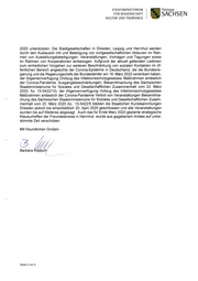 FÜR WISSENSCHAFT STAATSMINISTERIUM KULTUR UND TOURISMUS 2020 unterstützen. Die Stadtgesellschaften in Dresden, Leipzig und Herrnhut werden durch den Austausch mit und Beteiligung von zivilgesellschaftlichen Akteuren im Rah- men von Ausstellungsbeteiligungen, Veranstaltungen, Vorträgen und Tagungen sowie im Rahmen von Kooperationen einbezogen. Aufgrund der aktuell geltenden Leitlinien zum einheitlichen Vorgehen zur weiteren Beschränkung von sozialen Kontakten im öf- fentlichen Bereich angesichts der Corona-Epidemie in Deutschland, die die Bundesre- gierung und die Regierungschefs der Bundesländer am 16. März 2020 vereinbart haben, der Allgemeinverfügung (Vollzug des Infektionsschutzgesetzes; Maßnahmen anlässlich der Corona-Pandemie; Ausgangsbeschränkungen, Bekanntmachung des Sächsischen Staatsministeriums für Soziales und Gesellschaftlichen Zusammenhalt vom 22. März 2020, Az. 15-5422/10), der Allgemeinverfügung Vollzug des Infektionsschutzgesetzes Maßnahmen anlässlich der Corona-Pandemie Verbot von Veranstaltungen Bekanntma- chung des Sächsischen Staatsministeriums für Soziales und Gesellschaftlichen Zusam- menhalt vom 20. März 2020 Az.: 15-5422/5 bleiben die Staatlichen Kunstsammlungen Dresden jedoch bis einschließlich 20. April 2020 geschlossen und alle Veranstaltungen wurden bis auf Weiteres abgesagt. Auch das für Ende März 2020 geplante strategische Klausurtreffen der Freundeskreise in Herrnhut wurde aus gegebenem Anlass auf unbe- stimmte Zeit verschoben. Mit freundlichen Grüßen cW/2 Barbara lepsch/ Seite 5 von 5 Freistaat SACHSEN