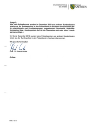 STAATSMlNlSTERIUM Freistaat DES INNERN SACH SEN Frage 3: Wie viele Polizeibeamte wurden im Dezember 2019 aus anderen Bundesländern sowie aus der Bundespolizei in den Polizeidienst in Sachsen übernommen? (Bit- te aufschlüsseln nach Laufbahngruppe, zugewiesener Dienststelle, Herkunfts- bundesland bzw. Bundespolizei und ob die Übernahme mit oder ohne Tausch- partner erfolgte.) lm Monat Dezember 2019 wurden keine Polizeibeamten aus anderen Bundesländern sowie aus der Bundespolizei in den Polizeidienst in Sachsen übernommen. ?feundhchen Grüßen r/Dr. Roland'Wöller Anlage Seite 2 von 2