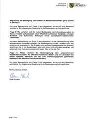 SÄCHSìSCHE Freistaat STAATSKANZLEI U SACHSEN Chef der Staatskanzlei und Staatsminister für Bu ndesan gelegen heiten und Medien SÄCHSISCHE STAATSKANZLEI Durchwahl 01095 Dresden Telefon +49 351 564-10100 Telefax +49 351 564-1010S poststelle@ Präsidenten des Sächsischen Landtages sk.sachsen.de Herrn Dr. Matthias Rößler Bern ha rd-von-Li ndena u-Platz 1 Geschäftszeichen (bitte bei Antwort angeben) 01067 Dresden sK.LS4.2-1 053 t67 t799- 2020125522 Kleine Anfrage des Abgeordneten Torsten Gahler (AfD) Dresden,l.J. März2o2o Drs.-Nr.: 711875 Thema: Stellungnahme eines Staatsministers zu medialen "Filterblasen" Sehr geehrter Herr Präsident, den Fragen sind folgende Ausführungen vorangestellt: "Staatsminister Oliver Schenk, Chef der Sächsischen Staatskanzlei, gab der Frankfurter Allgemeinen Zeitung am 06. Oktober 2019 ein lnterview zum Thema ,,Filterblasen" (https://www.faz.neVakluell/feuilleton/medien/ein- gespraech-mit-oliver-schenk-eine-nadel-die-die-filterblase-zum-platzen- bringt-16417074.htm1). Dort heißt es unter anderem: ,,Der öffentlich- rechtliche Rundfunk muss die Nadel sein, die die Filterblase ansticht und zum Platzen bringt: Mit sauber recherchiertem Journalismus, der aufklärt und umfassend informiert... "" .. 50 GEHT Namens und im Auftrag der Sächsischen Staatsregierung beantworte ich die sAcHsrscH Kleine Anfrage wie folgt: Die Kampagne des Frage l: Was versteht die Staatsregierung unter den sogenannten Freistaates Sachsen. ,,Filterblasen" und warum möchte sie die medialen Filterblasen in Sachsen zum Platzen bringen? Filterblasen sind lnformationsräume, die dem Einzelnen bestehende Meinungen und Ansichten wiederholend widerspiegeln und damit seine Posítion in beständiger Wiederkehr bestätigen, während gleichzeitig widersprechende Sichtweisen ignoriert werden. lm Übrigen wird von einer Beantwortung der Frage abgesehen, da sie auf eine Bewertung gerichtet ist. Zur Abgabe einer Bewertung ist die Staatsregierung nicht verpflichtet. Frage 2: Falls es der Staatsregierung dabei um Vielfalt statt gleichgeschalteter Einfalt geht, warum tut sie dann nichts für eine Hausanschr¡ft: Sächsische Staatskanzlei Archivstraße I 01097 Dresden Seite 1 von 2 www.sachsen.de
