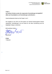 STAATSMINISTERIUM DER JUSTIZ Freistaat UND FÜR DET\4OKRATIE EUROPA UND GLEICHSTELLUNG U SACHSEN Frage 3: Aus welchen Gründen wurden die vorgenannten Veranstaltungen durchgeführt? (Bitte nach Haushaltjahren und Veranstaltungen aufschlüsseln.) Zusammenfassende Antwort auf die Fragen 2 und 3: Die Ausgaben für die 2018 und 2019 jeweils vom Sachsen-Verbindungsbüro Brüssel organisierten Veranstaltungen und die Gründe für die deren Durchführung sind der beigefügten Anlage zu entnehmen. Mit freundlichen Grüßen a Meier Anlage 1 Übersicht Seite 2 von 2