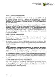STAATSMiNiSTERiUM Freistaat DES iNNERN SACHSEN Person 1 — türkischer Staatsanqehöriqer Der Betroffene reiste am 12. Oktober 2015 unerlaubt in die Bundesrepublik Deutschland ein. Seit dem 16. Januar 2018 bis zur lnhaftierung war der Betroffene nach unbekannt verzogen. Der Betroffene wurde am 21. November 2019 in Abschiebungssicherungshaft genommen. Am 10. Dezember 2019 wurde der Betroffene aus der Haft entlassen und in die Türkei abgeschoben. - Die Abschiebungsandrohung ist im Bescheid des Bundesamtes für Migration und Flücht- linge (BAMF) enthalten, mit dem der Asylantrag des Betroffenen abgelehnt wurde. Das Bundesamt teilte mit Schreiben vom 9. Dezember 2019 mit, dass der Betroffene einen Antrag auf Durchführung eines weiteren Asylverfahrens gestellt hat. Mit diesem Schrei- ben wurde auch mitgeteilt, dass ein weiteres Asylverfahren nicht durchgeführt wird, da die Voraussetzungen des § 51 Absatz 1 bis 3 des VenNaItungsverfahrensgesetzes (VwVfG) nicht vorliegen. Person 2 — svrischer Staatsanqehöriqer Bei dem Betroffenen handelt es sich um eine Person aus einem anderen Bundesland. Eine Aussage zum Asylverfahren und zu aufenthaitsbeendenden Maßnahmen kann die Staatsregierung daher nicht treffen. Der Betroffene wurde am 7. November 2019 in Haft genommen. Am 17. Dezember 2019 wurde er aus der Haft entlassen und zum Vollzug aufenthaltsbeendender Maßnahmen an die Polizei übergeben. Frage 2: Welche Erkenntnisse erlangte die Landesdirektion im Verlauf des Haftvollzugs über die Haftfähigkeit beider Menschen bzw. gab es Anhaltspunkte für psychische oder physische Erkrankungen, Störungen, Behinderungen und wenn ja, welche Medikamente wurden im Laufe des Haftvollzugs verschrieben? Der Landesdirektion Sachsen (LDS) liegen für beide Personen Hafttauglichkeitsbeschei- nigungen vor, die jeweils vor Haftbeginn ausgestellt wurden. Während des Vollzugs der Abschiebungshaft haben sich keine Anhaltspunkte für eine bestehende Haftuntaugiich- keit ergeben. Von einer weitergehenden Beantwortung wird abgesehen. Einer weiteren Beantwortung stehen Rechte Dritter im Sinne des Artikels 51 Absatz 2 der Verfassung des Freistaates Sachsen (SächsVerf) entgegen. Das Grundrecht auf in- formationelle Selbstbestimmung aus Artikel 33 SächsVerf zählt zu den Rechten Dritter im Sinne des Artikel 51 Absatz 2 SächsVerf. Seite 2 von 4