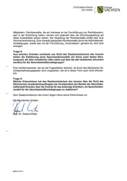 STAATSMINISTERIUM Freistaat DES INNERN SACHSEN Mitgliedern. Rechtsanwälte, die ein Interesse an der Durchführung von Rechtsberatun- gen in der Einrichtung haben, können sich jederzeit über die Einrichtungsleitung auf diese Auswahlliste setzen lassen. Die Vergütung der Rechtsanwälte erfolgt über eine Honorarvereinbarung. Eine Auswahl geeigneter Rechtsanwälte durch die Abschiebehaft- kontaktgruppe, soweit das mit der Formulierung „Vorsondieren“ gemeint ist, wird nicht erwogen. Frage 4: Aus welchen Gründen scheiterte aus Sicht des Staatsministeriums des Inneren bisher die Etablierung eines Sprechzeitenmodells (im Sinne einer festen Bera- tungszeit, die allen lnhaftierten offen steht und über die alle lnhaftierten informiert werden) für die Abschiebehaftkontaktgruppe? Eine Verfahrensweise, wie sie die Fragestellerin skizziert, ist durch das Sächsische Ab- schiebehaftvollzugsgesetz nicht vorgesehen. Sie ist in dieser Form auch nicht erforder- lich. Frage 5: Welche Erkenntnisse hat das Staatsministerium des Inneren über die Sicht des Sächsischen Ausländerbeauftragten als Vorsitzendem des Beirats der Abschiebe- haftanstalt Dresden über die Gründe für das bisherige Scheitern, ein Sprechzeiten- modell für die Abschiebehaftkontaktgruppe zu etablieren? Dem Staatsministerium des Innern liegen hierzu keine Erkenntnisse vor. Mi ndlichen Grüßen / .7: r f. Dr. Roland Wöller Seite 4 von 4
