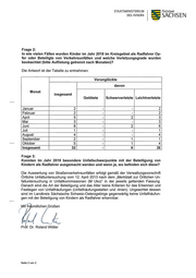 STAATSNIiNiSTERiUNI Freistaat DES iNNERN SACH SEN Frage 2: In wie vielen Fällen wurden Kinder im Jahr 2018 im Kreisgebiet als Radfahrer Op- fer oder Beteiligte von Verkehrsunfällen und welche Verletzungsgrade wurden beobachtet (bitte Auflistung getrennt nach Monaten)? Die Antwort ist der Tabelle zu entnehmen: Verunglückte davon Monat _ insgesamt Getötete Schwerverletzte Leichtverletzte Januar 03 N Februar ININI April Mai | Juni mA—xA—xcnmoomm I NU‘lN-h—‘CDQJLHNN Juli August m-A—‘I September Oktober I lnsgesamt Frage 3: Konnten im Jahr 2018 besondere Unfallschwerpunkte mit der Beteiligung von Kindern als Radfahrer ausgemacht werden und wenn ja, wo befinden sich diese? Die Auswertung von Straßenverkehrsunfällen erfolgt gemäß der Verwaltungsvorschrift Örtliche Unfalluntersuchung vom 12. April 2013 nach dem ,,Merkblatt zur Örtlichen Un- falluntersuchung in Unfallkommissionen (M Uko)“ in der jeweils geltenden Fassung. Danach sind die Art der Beteiligung und das Alter keine Kriterien für das Erkennen und Festlegen von Unfallhäufungen (Unfallhäufungssteilen und -Iinien). Ungeachtet dessen sind im Landkreis Sächsische Schweiz-Osterzgebirge gegenwärtig keine Unfallhäufun- gen mit der Beteiligung von Kindern als Radfahrer erkennbar. {4 La ndlichen Grüßen Pr f. Dr. Roland Wöller Seite 2 von 2