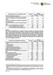 STAATSMINISTEmUM DES INNERN SACH SEN . „ davon Emstellung fur den 1. September 2019 gesamt weiblich männlich Anzahl der Bewerber (gesamt) 3.168 997 2.171 Anzahl erfolgreicher Absolventen des Auswahl— tests1 (vor Feststellung der Polizeidiensttauglich— 903 267 636 keit) Anzahl der schnftllch zur Ausbildung aufgeforder- 467 130 337 ten Absolventen figrz‘ahl der Personen, die die Ausbildung began- 375 108 267 davon an der Polizeifachschule Chemnitz 99 24 75 an der Polizeifachschule Leipzig 76 22 54 an der Polizeifachschule Schneeberg 200 62 138 Frage 3: Wie viele der gemäß Frage 1 erfragten Personen konnten aus welchen Gründen nicht in den Vorbereitungsdienst bei der sächsischen Polizei eingestellt werden? (Bitte aufschlüsseln nach Zahl der Bewerbungen, Geschlecht, fehlender persön- licher Voraussetzung mit genauer Angabe der Voraussetzungsart, Polizeidienst- untauglichkeit, Nichtbestehen des Auswahlverfahrens mit genauer Angabe des nicht bestandenen Teils des AWV, Absage bzw. Nichtantritt des Auswahlverfah- rens und sonstigen Gründen!) . . davon Anzahl nicht elngestellter Bewerber gesamt weiblich männlich aufgrund fehlender persönlicher Voraussetzungen 242 61 181 - Alter 55 9 46 - Schulabschluss 124 22 102 — Mindestgröße 48 28 20 - fehlender Schwimmnachweis 15 2 13 aufgrund Polizeidienstuntauglichkeit 108 33 75 aufgrund Bewerberüberprüfung 15 2 13 ääpgrund Platz In Rangfolgellste nlcht berucksnch- 416 122 294 Nichtbestehen des AWV 1.269 389 880 — computergestützter Fähigkeitstest 645 178 467 - physischer Eignungstest 434 160 274 - Gruppengespräch 144 42 102 — Einzelinterview 46 9 37 Bewerberabsagen (insgesamt) 566 201 365 Nichtantritt zum Auswahlverfahren 1.212 430 782 1 Im Rahmen des durchlässigen Auswahlverfahrens wechselten 429 Personen (darunter 139 Frauen) nach dem compu- tergestützten Fähigkeitstest bzw. dem Gruppengespräch vom Auswahlverfahren für die Laufbahngruppe 2.1 der Fach- richtung Polizei (Pol) in das Auswahlverfahren für die Laufbahngruppe 1.2 Pol. Diese Bewerber sind hier mit berück- sichtigt. In die Rangfolgeliste für die Einstellungen in den Vorbereitungsdienst der Laufbahngruppe 1.2 Pol reihten sich weiter- hin 191 Personen (darunter 60 Frauen) aus den Auswahlverfahren für die Laufbahngruppe 2.1 Pol ein. welche das Auswahlverfahren für die Laufbahngruppe 2.1 Pol erfolgreich bestanden haben. Seite 2 von 3