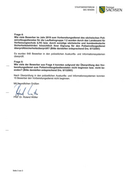 STAATSMINISTERIUM Freistaat DES INNERN SACH SEN Frage 4: Wie viele Bewerber im Jahr 2019 zum Vorbereitungsdienst des sächsischen Poli- zeivollzugsdienstes für die Laufbahngruppe 1.2 wurden durch das Landesamt für Verfassungsschutz (LfV) bzw. durch sonstige sächsische und bundesdeutsche Sicherheitsbehörden hinsichtlich ihrer Eignung für den Polizeivollzugsdienst überprüft/sicherheitsüberprüft? (Bitte darstellen entsprechend Drs. 6I13295!) Es wurden 648 Bewerber in den polizeilichen Auskunfts- und Informationssystemen überprüft. Frage 5: Wie viele der Bewerber aus Frage 4 konnten aufgrund der Überprüfung den Vor- bereitungsdienst zum Polizeivollzugsbediensteten nicht beginnen bzw. nicht be- enden? (Bitte darstellen entsprechend Drs. 6/13295!) Nach Überprüfung in den polizeilichen Auskunfts- und Informationssystemen konnten 15 Bewerber den Vorbereitungsdienst nicht beginnen. undlichen Grüßen TU D.r. Roland Wöller Seite 3 von 3