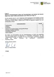 STAATSMINISTERIUM DES INNERN 4 SACHSEN x FrEIstaat Frage 2: hatten die Tatverdächtigen und welchen die Geschä- Welchen Aufenthaltsstatus digten bzw. Opfer? (Bitte aufschlüsseln nach Fällen aus Frage 1!) bega ng en en 81 6 Stra ftat en ko nn te n Zu den zwischen dem 6. und 8. September 2019 St aa tsbürg er sc ha ft un d 44 ni ch td eu ts ch e Ta t- bisher 181 Tatverdächtige mit deutscher im PA SS mi t fo lg en de n An ga be n zu m Au f— verdächtige ermittelt werden. Letztere sind enthaltsstatus erfasst: Aufenthaltsstatus Anzahl 2 (‚1433—wa Asylbewerber Duldung EU—Bürger Schutz — und As yl be re ch ti gt e, Ko nt in ge nt flücht li ng e Sonstiger erlaubter Aufenthalt Unerlaubter Aufenthalt Keine Angaben fe nt ha lt ss ta tu s im PA SS ni ch t ab ge bi ld et . Bei Opfern und Geschädigten wird der Au im Ka ta lo gf el d „O pf er sp ez if ik “ de n We rt Seit 2016 besteht jedoch die Möglichkeit, in de r Fr ag e 1 genannten St raft at en „Asylbewerber/Flüchtling“ zu erfassen. Für die bei sieben Personen der Katalogwert „Asylbewerber! wurde Flüchtling“ erfasst. { . } Mi_t‚.f undlichen Grüßen M rof. Dr. Roland Wöller Anlage Seite 2 von 2
