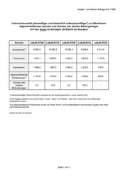Anlage 1 zur Kleinen Anfrage Drs. 7/665 1 Unterrichtsausfall (planmäßiger und tatsächlich außerplanmäßiger ) an öffentlichen allgemeinbildenden Schulen und Schulen des zweiten Bildungsweges im Fach Kunst im Schuljahr 2018/2019 (in Stunden) Schulart LaSuB-STOB LaSuB-STOC LaSuB-STOD LaSuB-STOL LaSuB-STOZ 2) Grundschule 8.883,4 10.662,3 12.282,4 9.056,8 9.413,4 Oberschule 1.937,1 2.657,6 2.863,2 2.823,8 1.176,3 Gymnasium 1.688,0 1.687,0 2.993,0 2.232,5 716,0 allgemeinbildende 3) 1.194,8 1.914,8 2.494,2 1.384,4 823,8 Förderschule Schulen des zweiten 0,0 10,0 0,0 152,0 - Bildungsweges 1) außerplanmäßiger Unterrichtsausfall vermindert um die Vertretungsstunden in einem anderen Fach 2) Die Angaben beziehen sich auf die Fächer "Kunst", "Musik" und "Werken". Das Fach "Kunst" kann nicht differenziert ausgewiesen werden. 3) an allgemeinbildenden Förderschulen wurden die Fächer "Kunst" und "Kunst/Modellieren" berücksichtigt; Angaben ohne Klinik- und Krankenhausschulen Quelle: Berichte der Schulen Seite 1 von 1