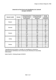 Anlage 2 zur Kleinen Anfrage Drs. 7/665 Unterricht im Fach Kunst nach Qualifikation der Lehrkraft Schuljahr 2018/2019 Unterrichtsstunden Unterrichtsstunden Anzahl Standort LaSuB Schulart pro Woche Kunst pro Woche Kunst Lehrkräfte mit Fachlehrer* fachfremd fachfremd GS 702 321 115 OS 614 135 26 Bautzen GY 506 115 11 FS 118 175 76 GS 814 755 236 OS 636 379 52 Chemnitz GY 698 141 11 FS 167 267 93 GS 833 1077 293 OS 887 289 42 Dresden GY 1210 72 10 FS 67 380 126 GS 912 991 286 OS 619 503 76 Leipzig GY 1007 188 32 FS 147 279 102 GS 470 423 149 OS 482 169 25 Zwickau GY 548 57 7 FS 50 202 71 * Begriffsbestimmung Fachlehrer: Lehrkräfte mit Lehrbefähigung, Lehrerlaubnis, abgeschlossenem Zertifikatskurs oder Anerkennung des Abschlusses für das jeweilige Unterrichtsfach Quelle: SaxSVS, 2.Stichtag Schuljahr 2018/2019 Seite 1 von 1