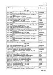 Anlage 2 zu Drs.-Nr. 7/1819 Tatzeit Straftat Gemeinde Jahr 2018 03.02.2018 V_enN_enden von Kennzeichen verfassungswidriger Orga- Großenhain nlsatlonen gem. § 863 StGB 08.02.2018 gteägnders schwerer Fall des Dlebstahls gem. § 243 Radebeul 23.03.2018 Bedrohung gem. § 241 StGB Riesa 28.03.2018 Körperverletzung im Amt gem. § 340 StGB Riesa 11.04.2018 Sachbeschädigung gem. § 303 StGB Nossen 13.04.2018 Diebstahl gem. § 242 StGB Coswig 02.05.2018 gteégnders schwerer Fall des Diebstahls gem. § 243 Radebeul Verwenden von Kennzeichen verfassungswidriger Orga- . 08.05.2018 nisationen gem. § 86a StGB Großenhain 14.09.2018 Sachbeschädigung gem. § 303 StGB Radebeul 24.09.2018 Straftat nach dem Betäubungsmittelgesetz Coswig 02.10.2018 Sachbeschädigung gem. § 303 StGB Nossen Diebstahl, Unterschlagung geringwertiger Sachen gem. . 13.10.2018 ä 248a StGB Coswng 19.10.2018 Sachbeschädigung gem. § 303 StGB Großenhain 08.11.2018 gteägnders schwerer Fall des Dlebstahls gem. § 243 Radebeul 09.11.2018 äteägnders schwerer Fall des Diebstahls gem. § 243 Riesa 03.12.2018 gteägnders schwerer Fall des Diebstahls gem. § 243 Radebeul 07.12.2018 Diebstahl gem. § 242 StGB Radebeul 07.12.2018 Diebstahl gem. § 242 StGB Coswig Jahr 2019 01.01.2019 Sachbeschädigung gem. § 303 StGB Großenhain 08.01.2019 Beleidigung gem. § 185 StGB Coswig 31.01.2019 Straftat nach dem Betäubungsmittelgesetz Großenhain 01.02.2019 Straftat nach dem Betäubungsmittelgesetz Großenhain 11.022019 gteesgnders schwerer Fall des Diebstahls gem. § 243 Coswig 12.02.2019 Diebstahl gem. § 242 StGB Coswig 04.04.2019 Körperverletzung gem. § 223 StGB Riesa 09.04.2019 Fahrlässige Körperverletzung gem. § 229 StGB Nossen 13.06.2019 Straftat nach dem Betäubungsmittelgesetz Meißen 13.06.2019 Straftat nach dem Betäubungsmittelgesetz Meißen 13.06.2019 Straftat nach dem Betäubungsmittelgesetz Meißen 19.07.2019 Sachbeschädigung gem. § 303 StGB Coswig 26.08.2019 Hausfriedensbruch gem. § 123 StGB Radebeul 05.09.2019 Sachbeschädigung gem. § 303 StGB Coswig 12.09.2019 Sachbeschädigung gem. § 303 StGB Coswig 13.09.2019 Diebstahl gem. § 242 StGB Riesa 22092019 Sexuelle Ubergrlffe unterAusnutzung elnes Uberra— Riesa schungsmoments gem. § 177 Abs. 2 Nr. 3 StGB Seite 1 von 2