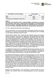 STAATSMINISTERIUM Freistaat DES iNNERN SACH SEN Dienststellen und Einrichtungen Krankenstand (2) Tage % BPP 30,8 8,42 PVA 25,8 7,05 Hochschule der Sächsischen Polizei (FH) 25,9 7,09 Frage 3: Wie hoch ist der jeweilige Anteil an Tarifbeschäftigten und Beamten in den jewei- ligen Beh6rden sowie deren nachgeordneten Dienststellen und Alterskohorten (bis bzw. ab dem 51. Lebensjahr), die länger als zwölf Wochen bzw. sechs Mona- te krank sind? (Bitte vollständige Auflistung der nachgeordneten Dienststellen!) Von einer umfassenden Beantwortung wird abgesehen. Die zur Beantwortung der Frage notwendigen Erkenntnisse hinsichtlich der Erkran— kungsdauer von mehr als sechs Monaten liegen der Staatsregierung nicht unmittelbar vor. Sie müssten aufwändig recherchiert werden. Gemäß Artikel 51 Absatz 1 Satz 1 Verfassung des Freistaates Sachsen ist die Staats- regierung verpflichtet, Fragen einzelner Abgeordneter oder parlamentarische Anfragen nach bestem Wissen unverzüglich und vollständig zu beantworten. Nach dem Grund- satz der Verfassungsorgantreue ist jedes Verfassungsorgan verpflichtet, bei der Aus- übung seiner Befugnisse den Funktionsbereich zu respektieren, den die hierdurch mit- betroffenen Verfassungsorgane in eigener Verantwortung wahrzunehmen haben. Die- ser Grundsatz gilt zwischen der Staatsregierung und dem Parlament sowie seinen ein- zelnen Abgeordneten, so dass das parlamentarische Fragerecht durch die Pflicht des Abgeordneten zur Rücksichtnahme auf die Funktions- und Arbeitsfähigkeit der Staats- regierung begrenzt ist. Die Staatsregierung muss nur das mitteilen, was innerhalb der Antwortfrist mit zumutbarem Aufwand in Erfahrung gebracht werden kann. lm vorliegenden Fall wäre durch eine vollständige Beantwortung die Arbeits- und Funk— tionsfähigkeit der Staatsregierung gefährdet, weil bei der statistischen Erfassung der Krankheitsdaten eine Differenzierung nur nach der Erkrankungsdauer von weniger als sechs Wochen, länger als sechs Wochen und länger als zwölf Wochen erfolgt. Eine elektronische Recherche hinsichtlich der Erkrankungsdauer von mehr als sechs Monaten ist nicht ohne Weiteres möglich. Die notwendigen Daten können nur durch die händische Auswertung von mehr als 14.000 Personalakten erlangt werden. Für die Auswertung im Sinne der Fragestellung wird von einer Bearbeitungszeit von nicht unter zehn Minuten pro Akte ausgegangen. Ausgehend von einer 40-Stunden-Woche sind daher mindestens 14 Mitarbeiter notwendig, um die Frage innerhalb des zur Verfügung stehenden Zeitraums von vier Wochen zu beantworten. Andere Aufgaben, wie z. B. die den Behörden obliegende PersonalvenNaltung können währenddessen nicht wahrge- nommen werden. Hinzu treten Bedenken hinsichtlich des Datenschutzes, da es sich bei der Personengruppe „der länger als sechs Monate Erkrankten“ um einen kleinen Kreis handelt, so dass eine Anonymisierung zumindest nicht in allen Fällen gewährleis— tet werden könnte. Bezüglich des Krankenstandes im Jahr 2019 liegen, wie bereits enNähnt‚ für die Be- diensteten unter anderem Daten zum Gesamtkrankenstand und zum Krankenstand Seite 3 von 6